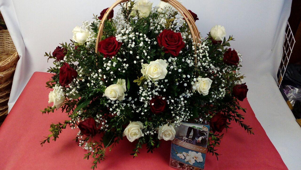 This is specific Basket arrangement with the even number of of Red and White Classic roses. Such even numbers arerangements are acceptable for memorial events only for Slavic culture .
