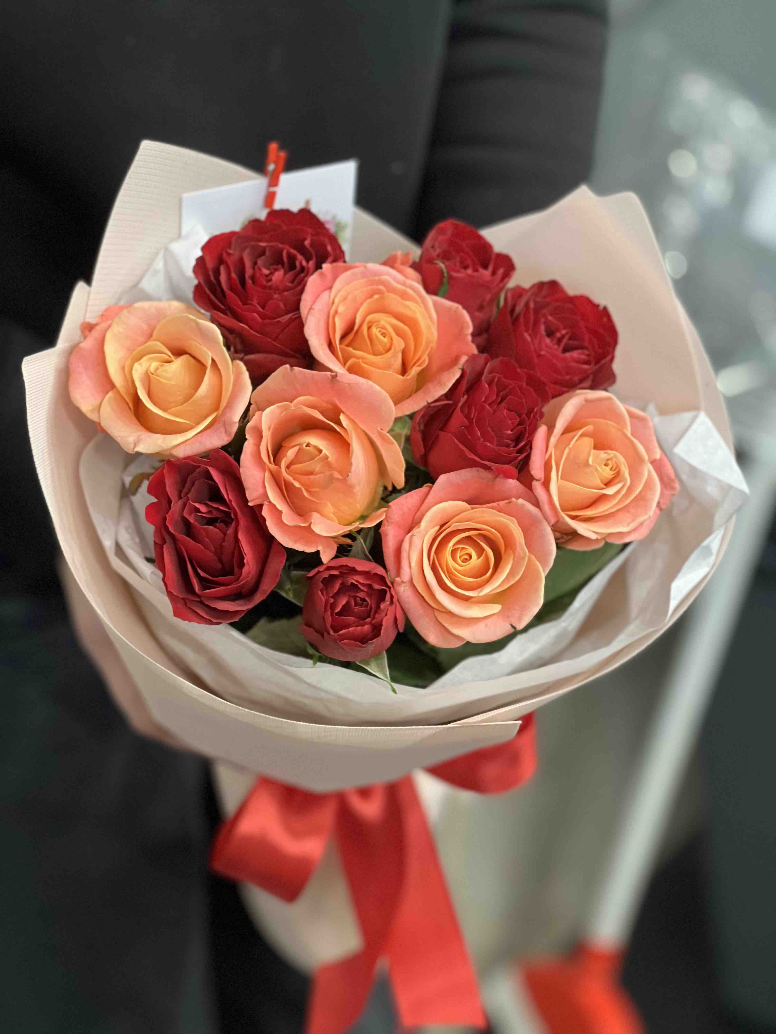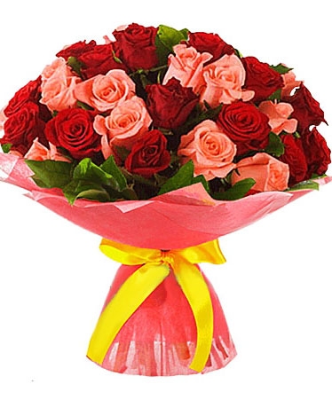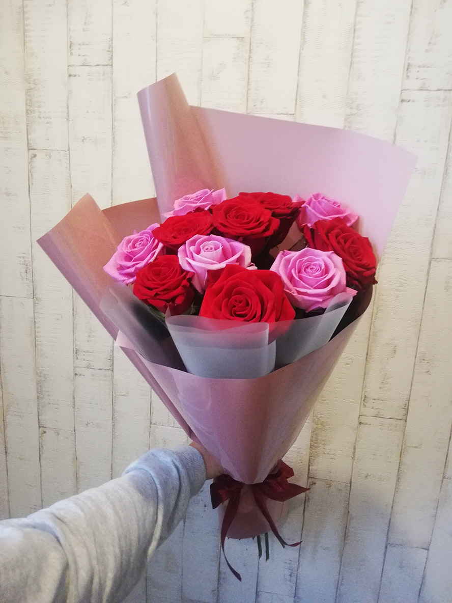 Red and Pink Classic Roses bouquet, arranged in floral paper with a satin bow.