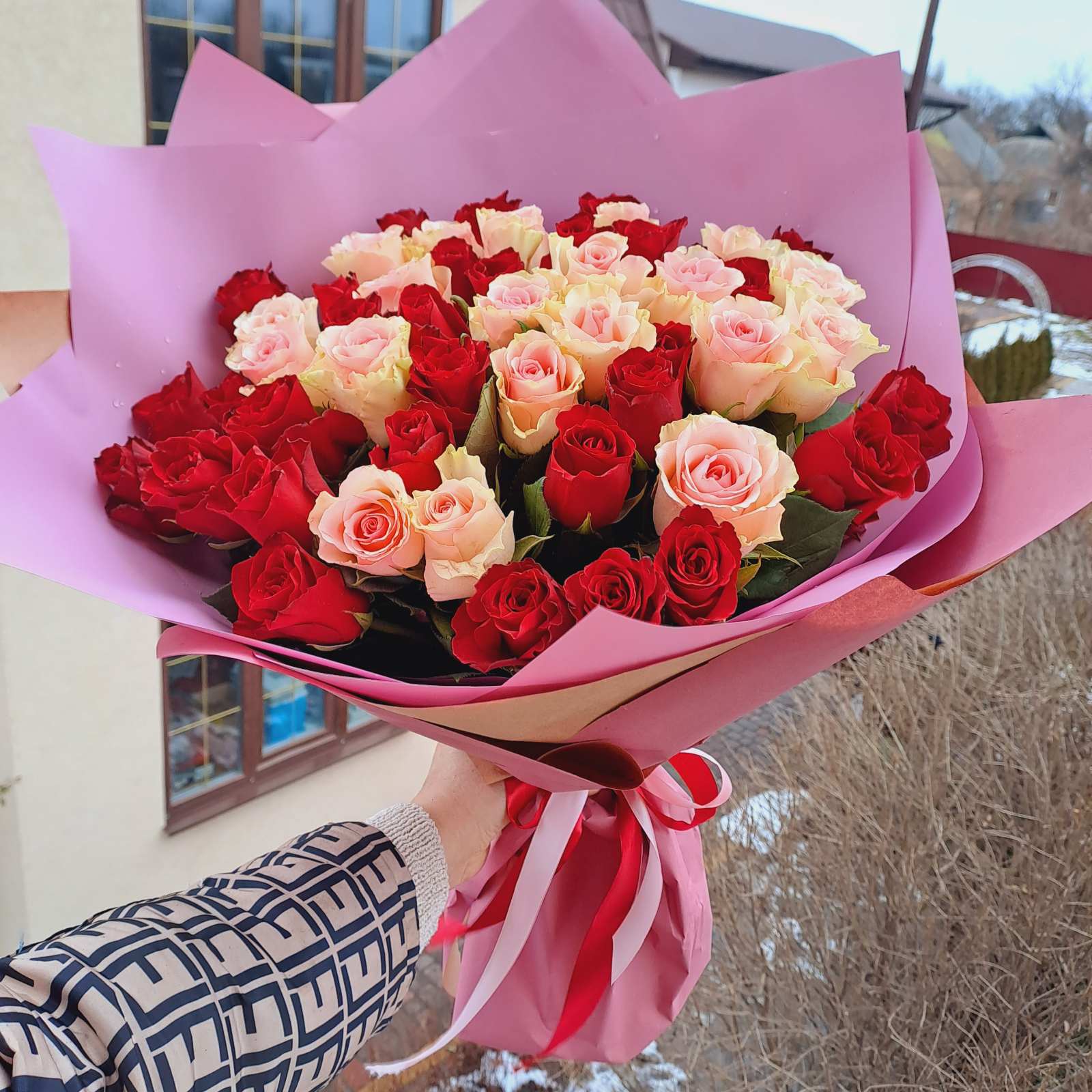 Our photo shows 51 Red & Pink Classic roses bouquet, but you might choose any other number.