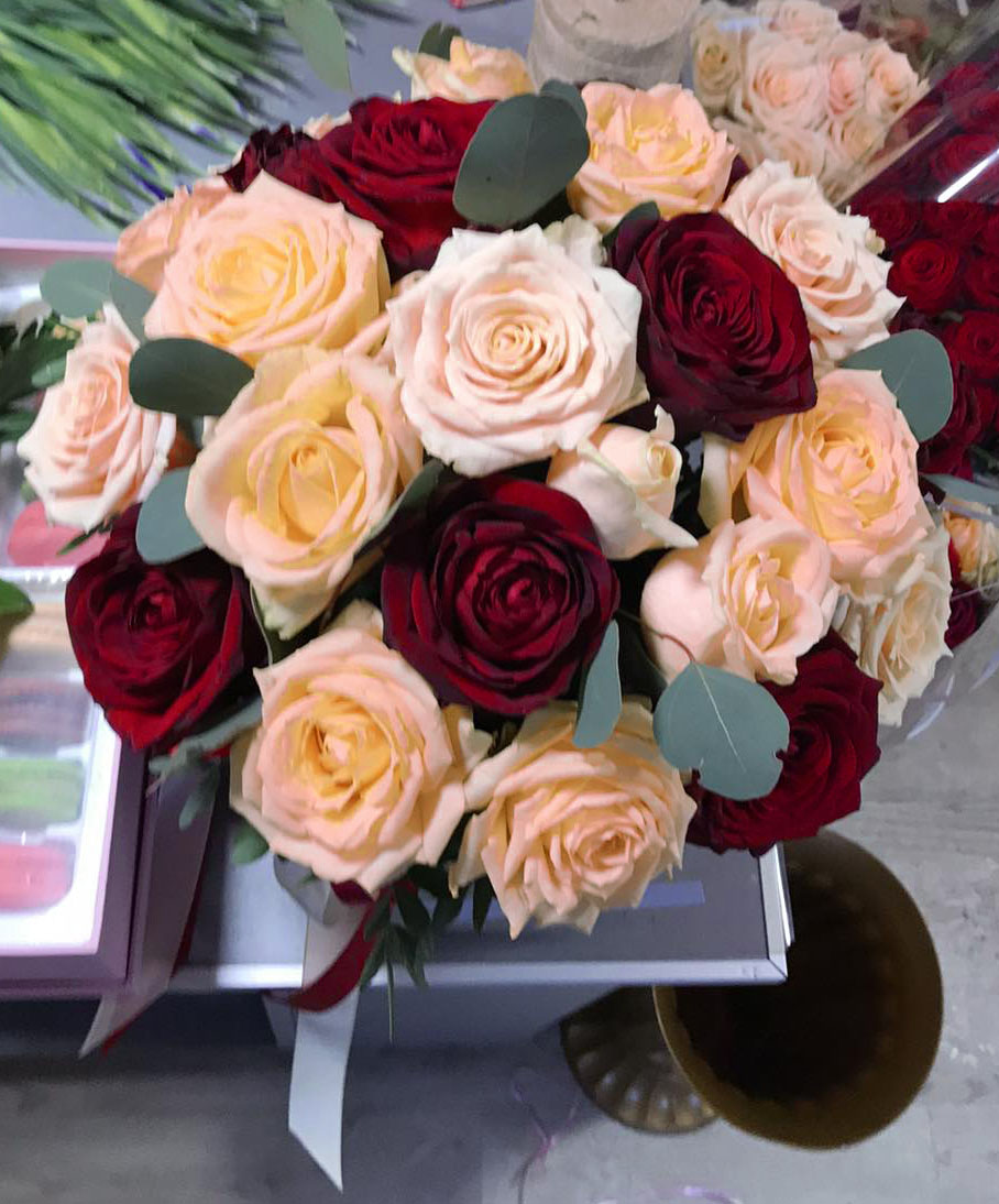 The color of the box may not match what the one at our photo as the set of floral materials is changing permanently. We'll pick the most convenient for this arrangement!