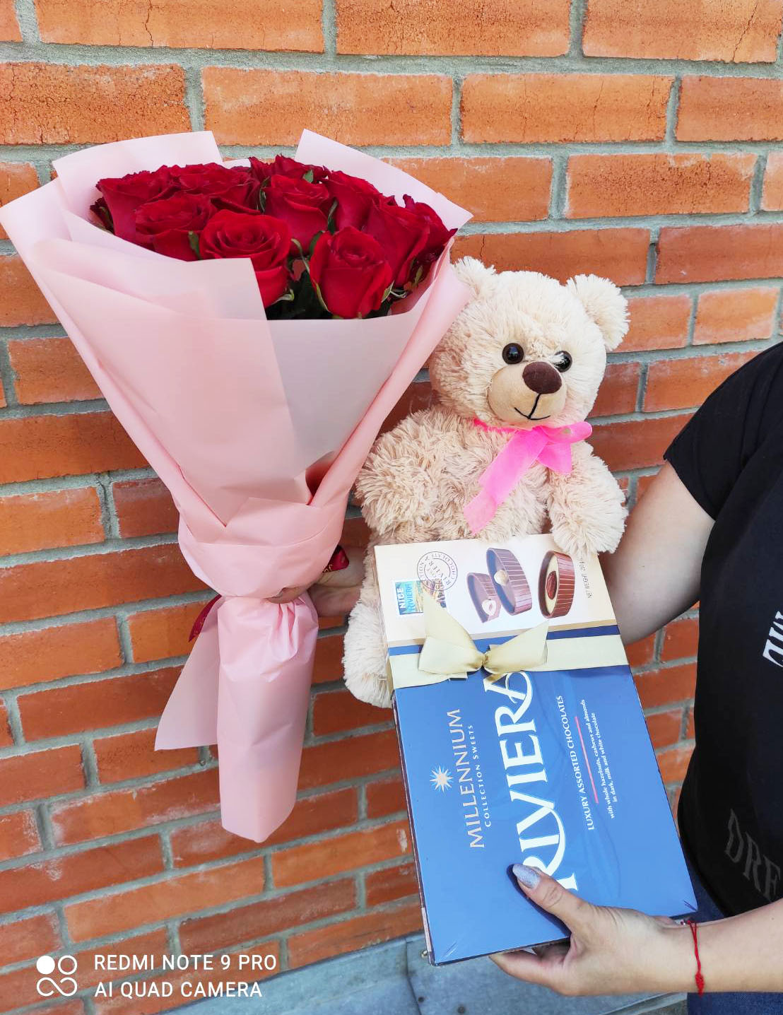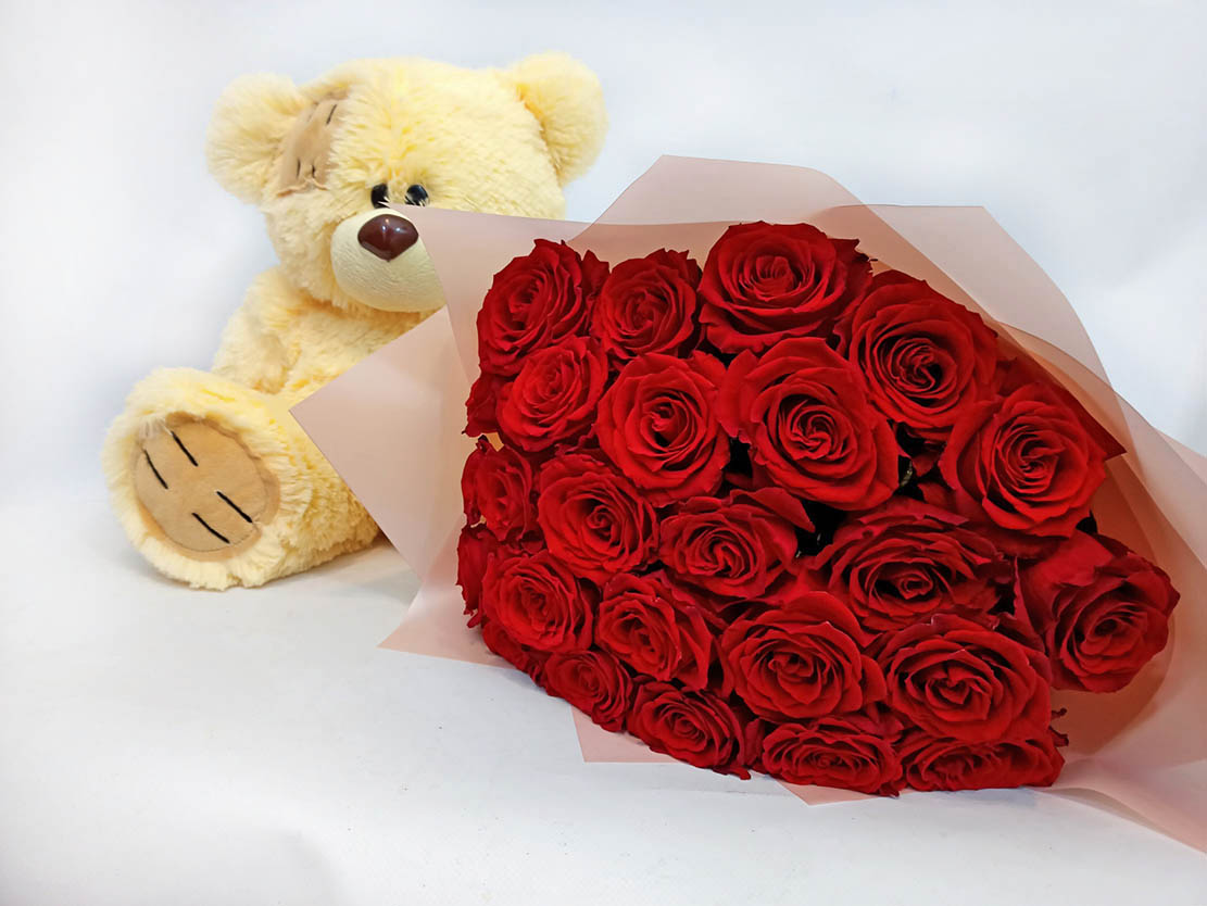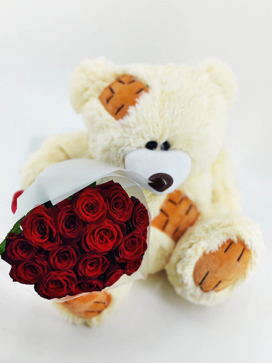 2) Medium : a 40-50 cm Bear + 15 Ruby Rain Roses bouquet - PLEASE, order 2-3 days prior the delivery date!