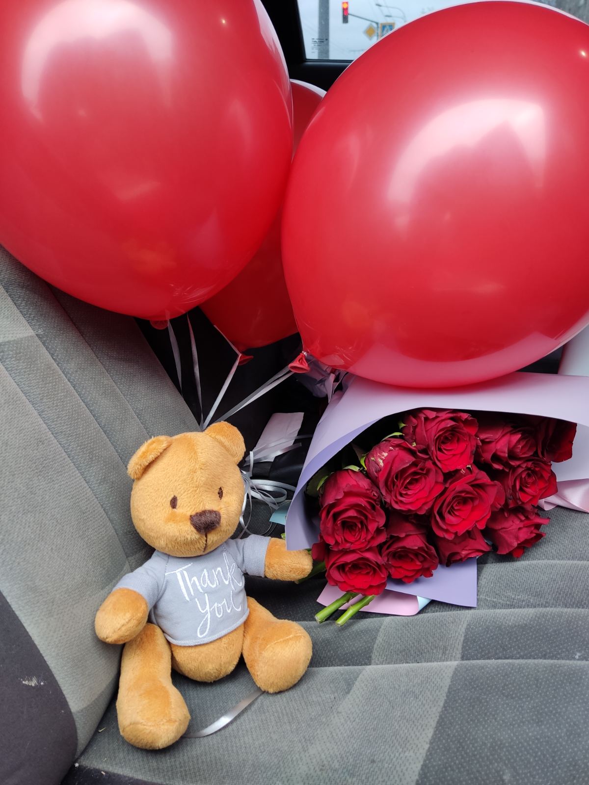 The color of the Bear can be different than the one at the photo: florists buy it at the local shops after getting a certain order. They select the most appropriate there.