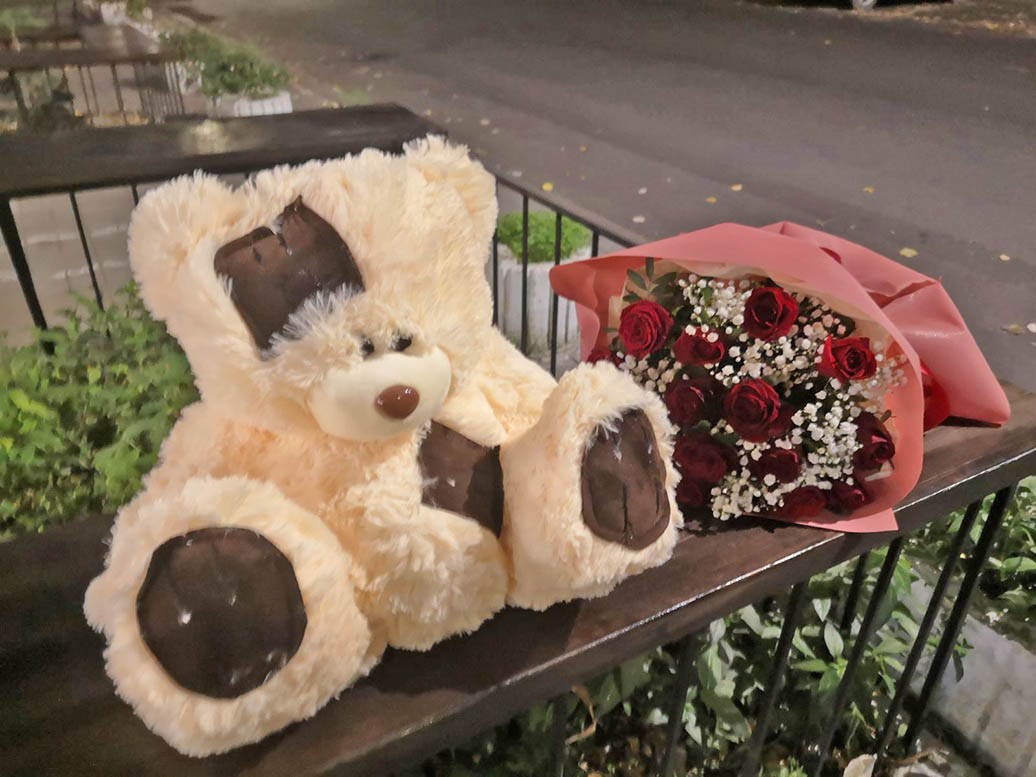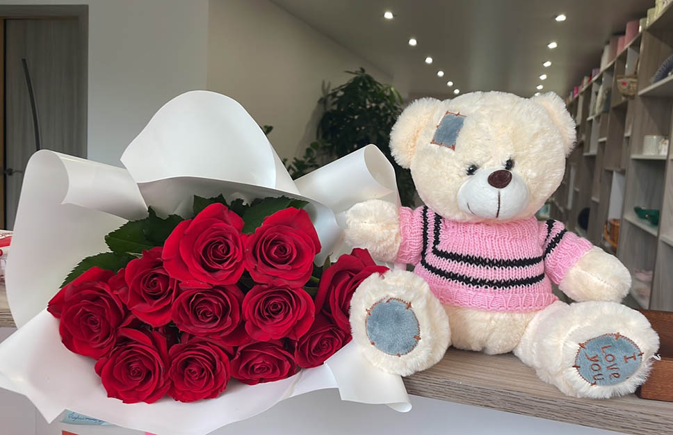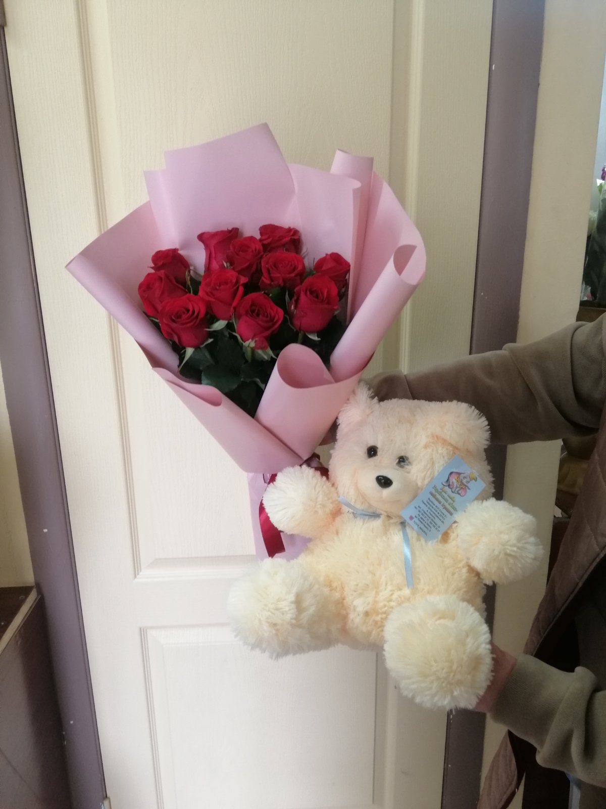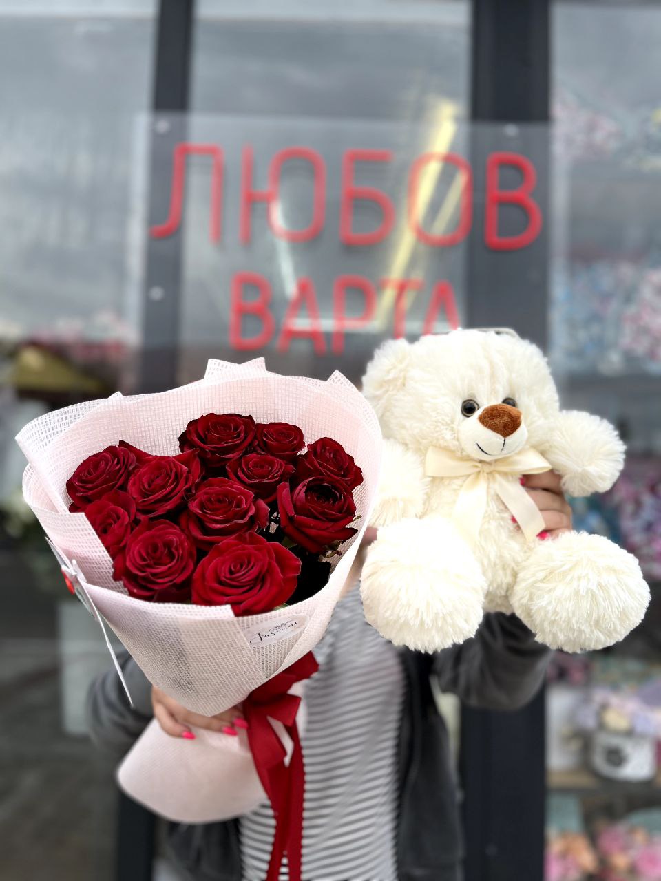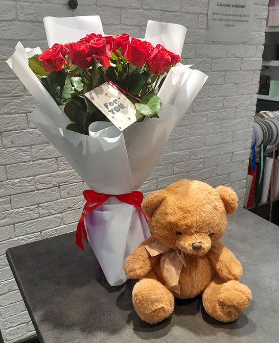 1) Small - a 25-30 cm Bear + 11 Ruby Rain Roses bouquet