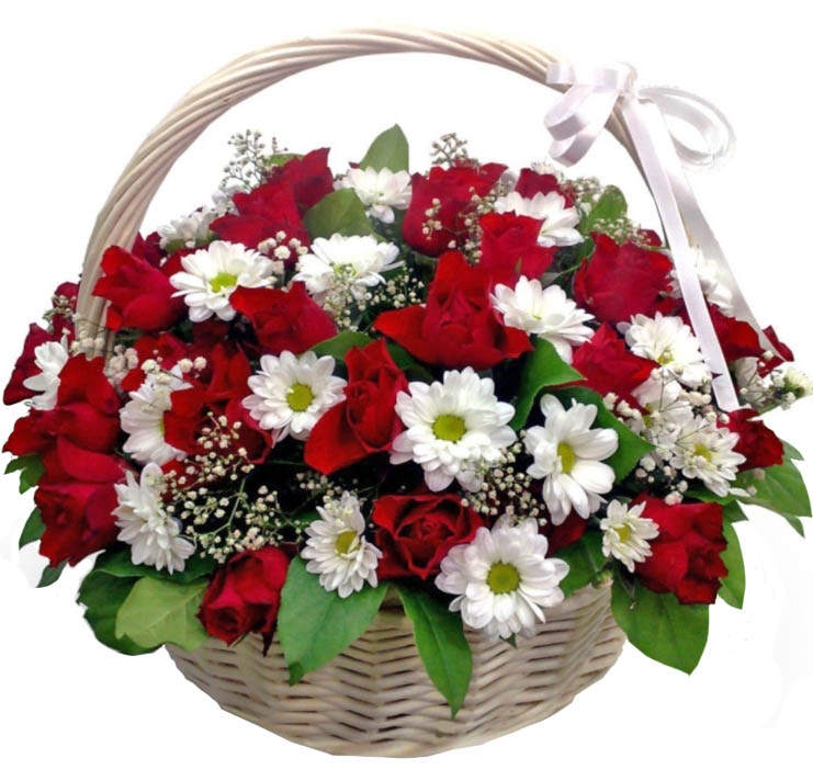 Large Basket: 25 Classic Red Roses and + 9 White Chrysanthemums' Dasies