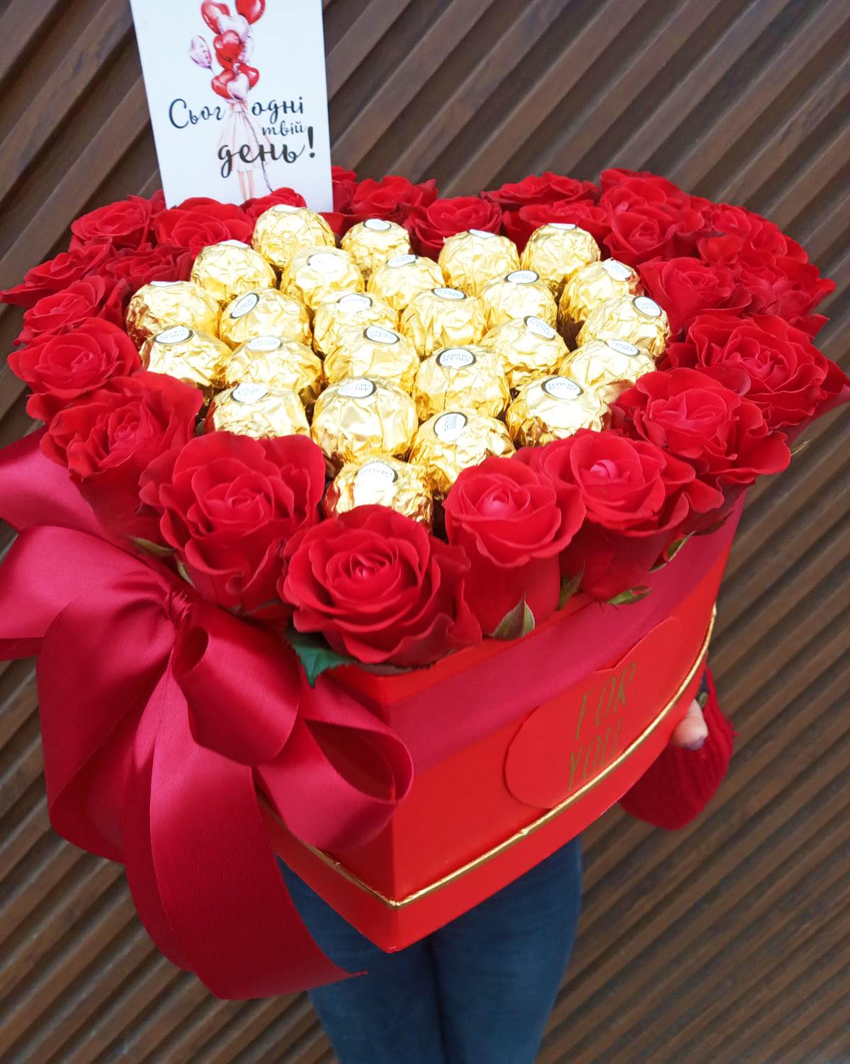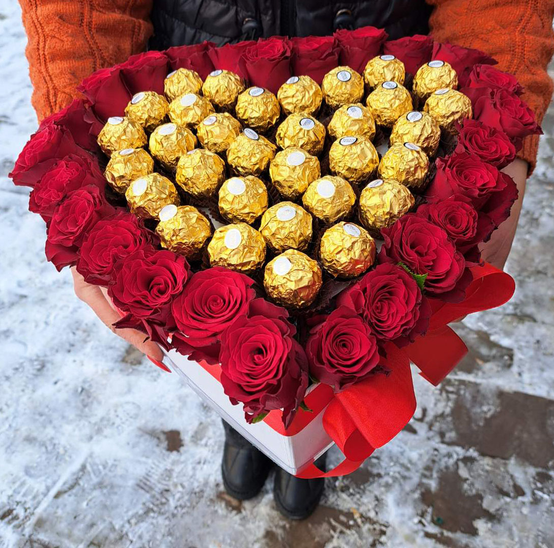 Red roses & Ferrero Rocher chocolates heart shaped arrangement.