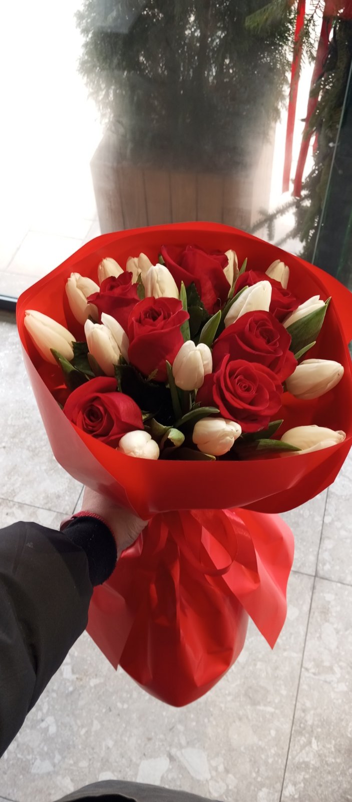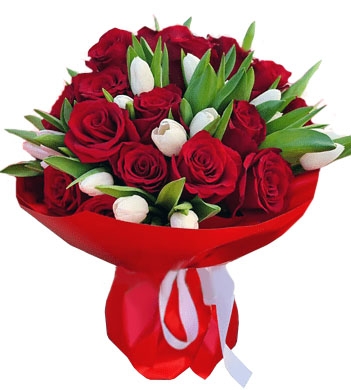 IMPORTANT : Bouquet of Bright Red or Crimson Roses and White Tulips is available apprx from January-February to April - at the tulips blossoming season. White tulips will be substituted with other cute white flowers if this bouquet is ordered at the other seasons.