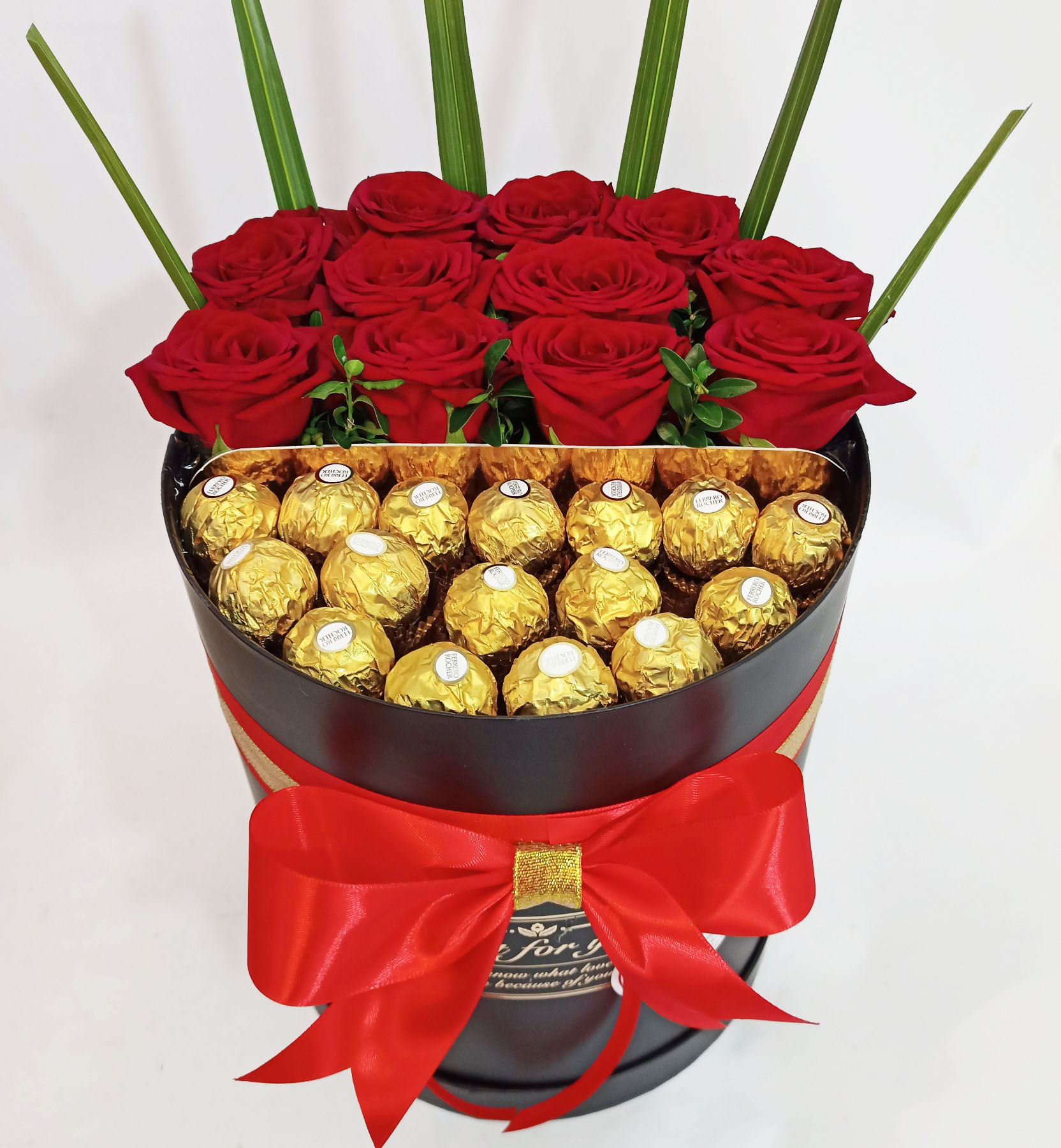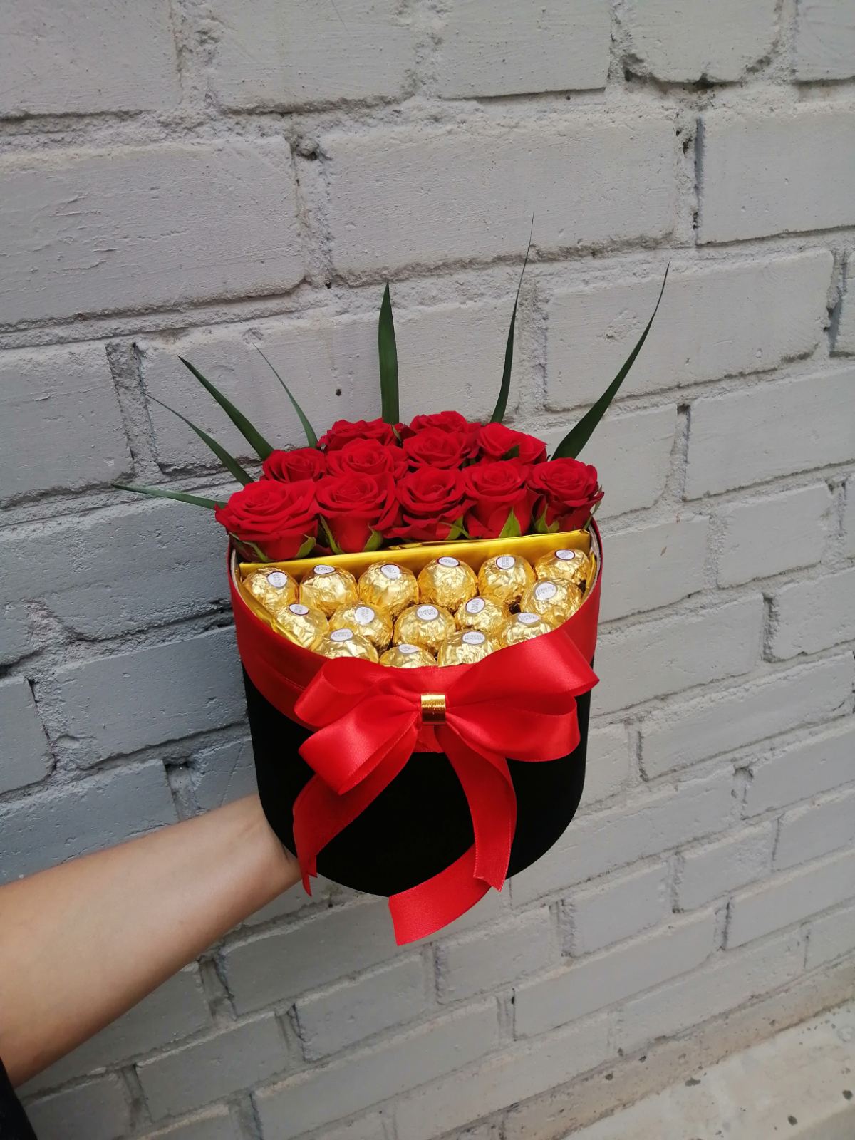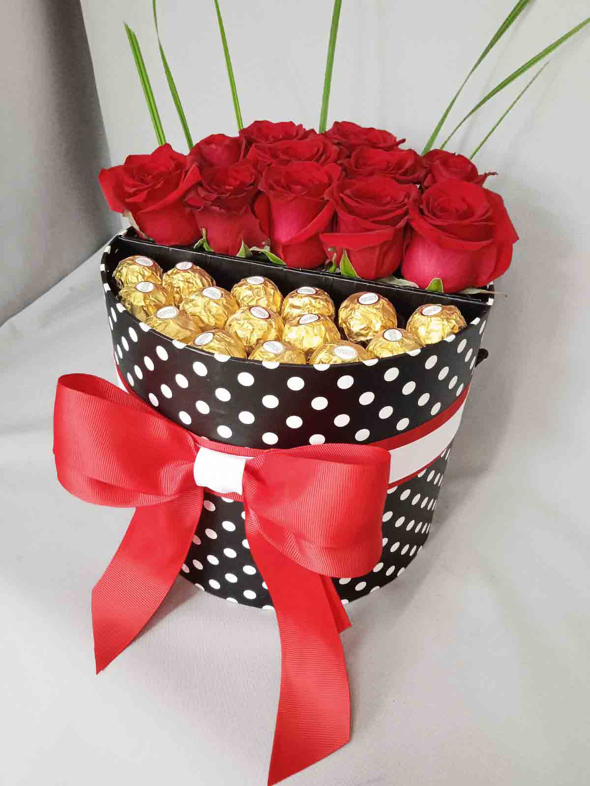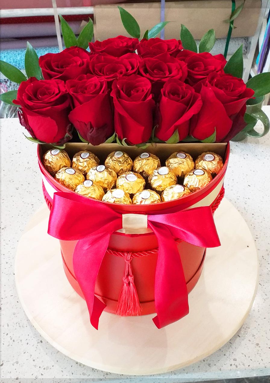 We made an amazing composition of elegant red roses and golden chocolates Ferrero Rocher in a stylish black box decorated with a red and yellow bow.