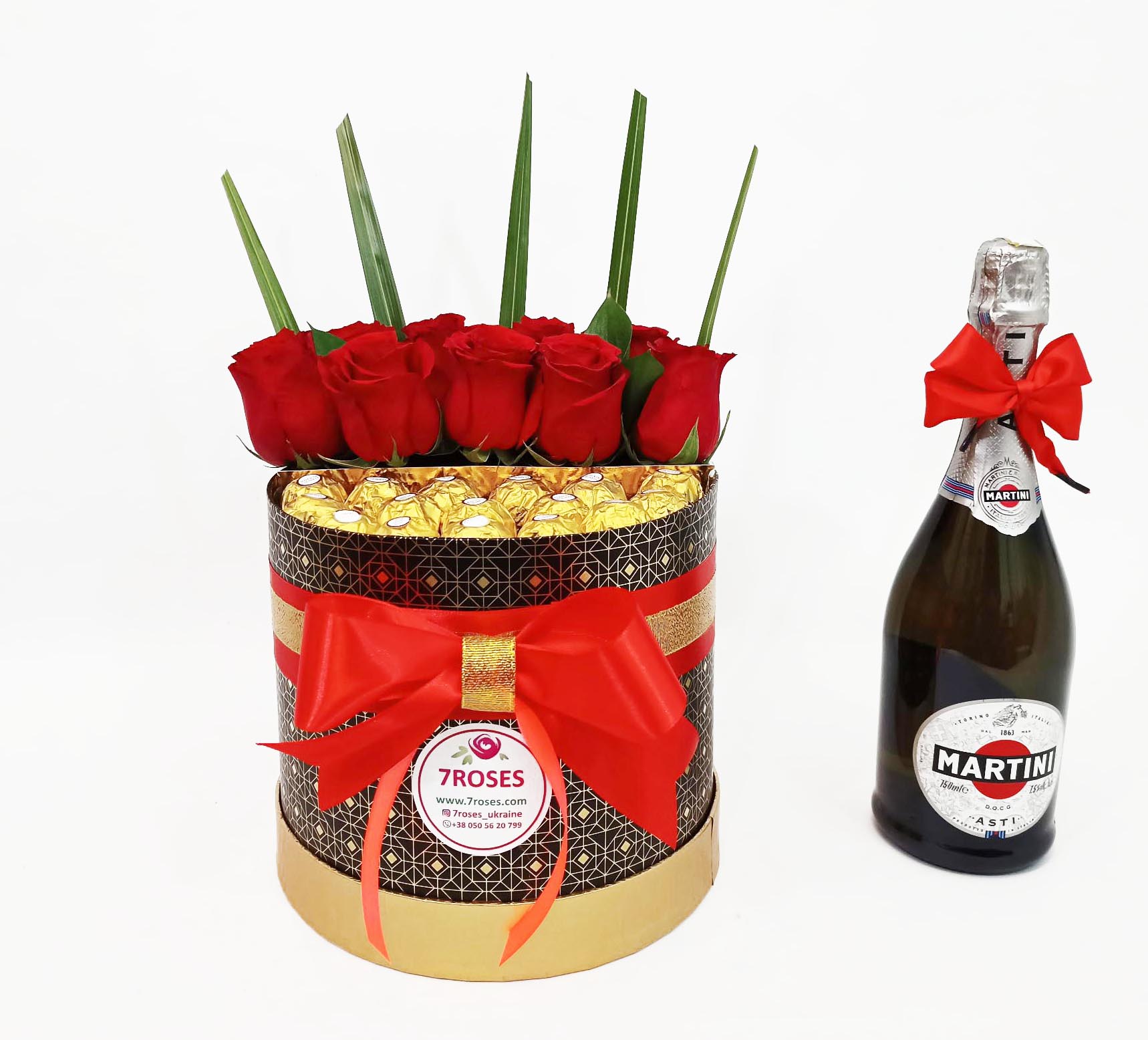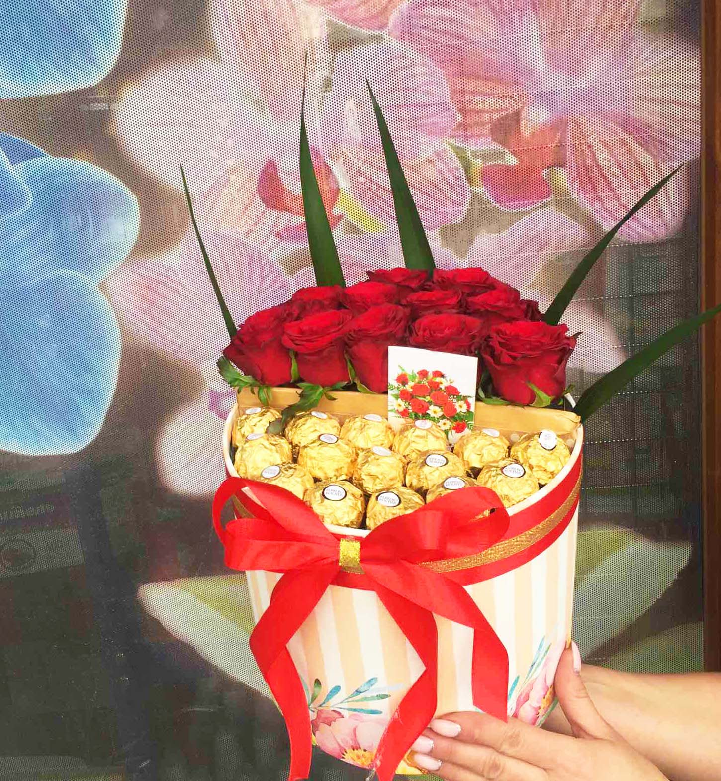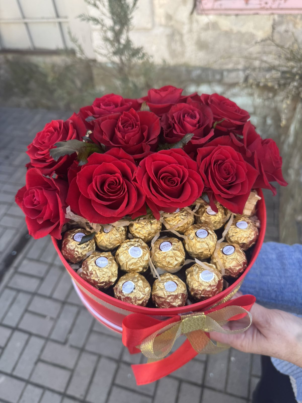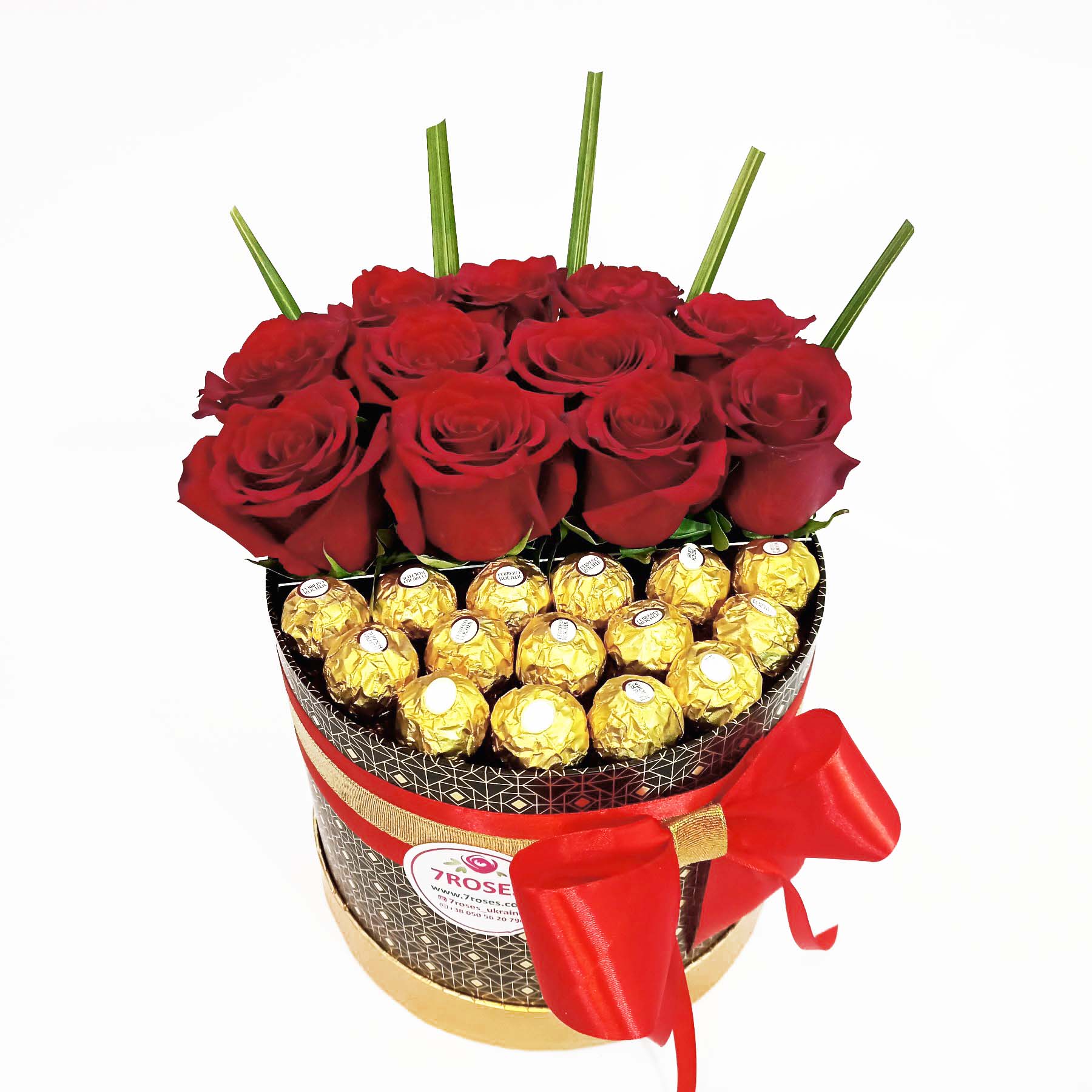 We made an amazing composition of elegant red roses and golden chocolates Ferrero Rocher in a stylish black box decorated with a red and yellow bow.