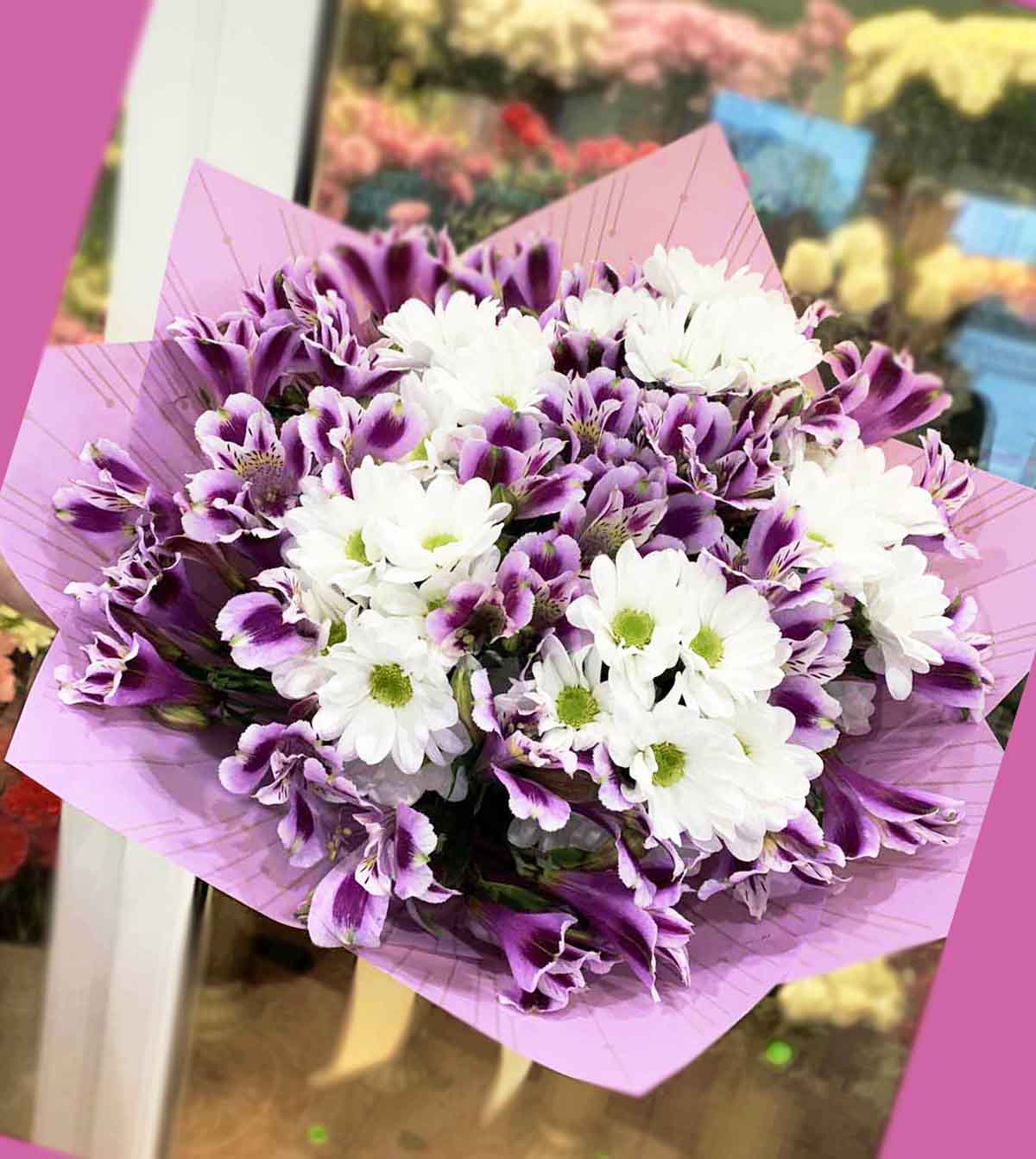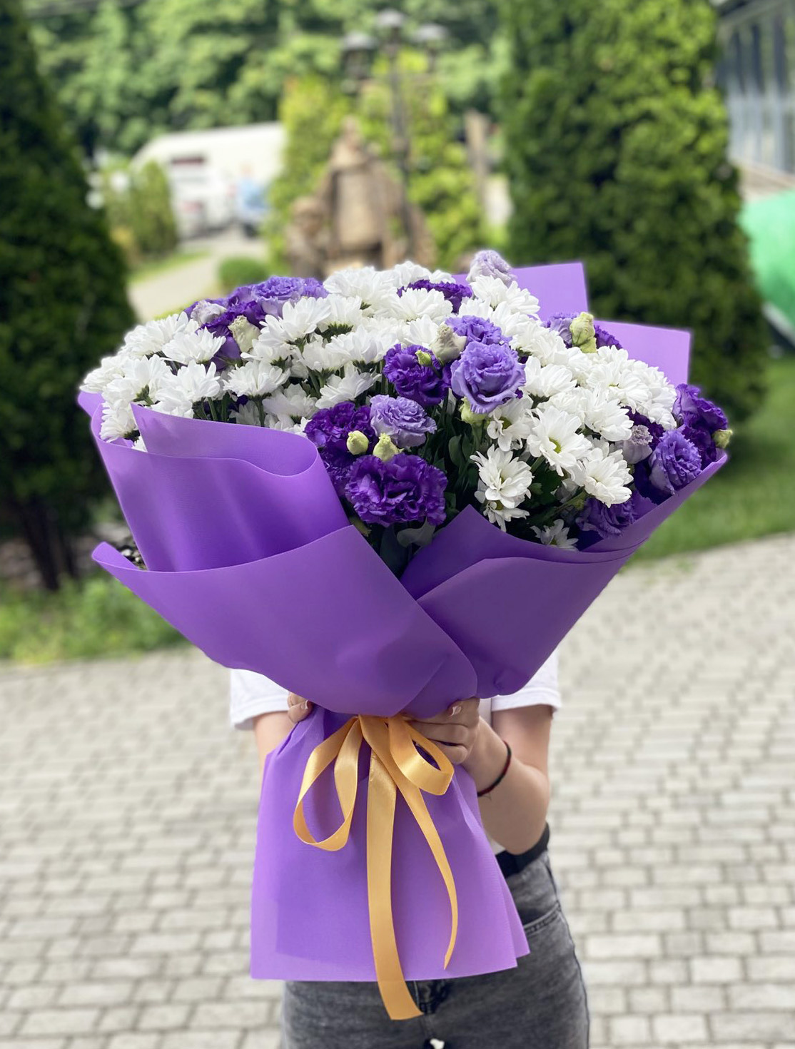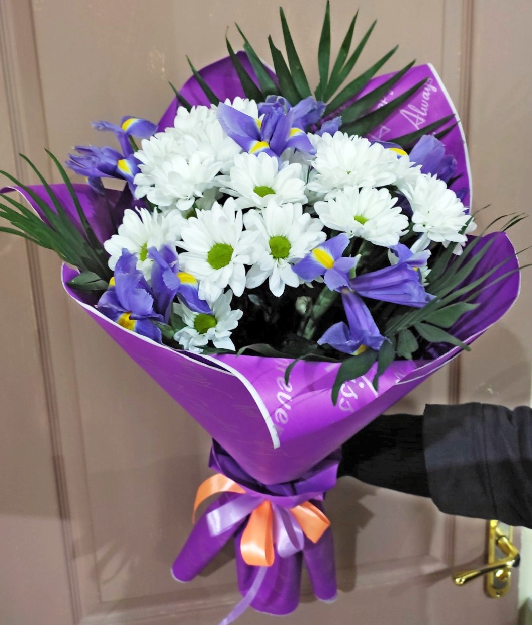 - 3 хризантемы - 5 ирисов или 3 ветки эустомы (а это 10-12 распустившихся цветков + много бутонов), или другие синие цветы на оплаченную сумму
