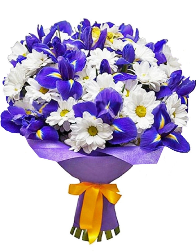 - 5 хризантем - 11 ирисов или 6 веток эустом (много распустившихся цветков + еще больше бутонов), или другие синие цветы на оплаченную сумму