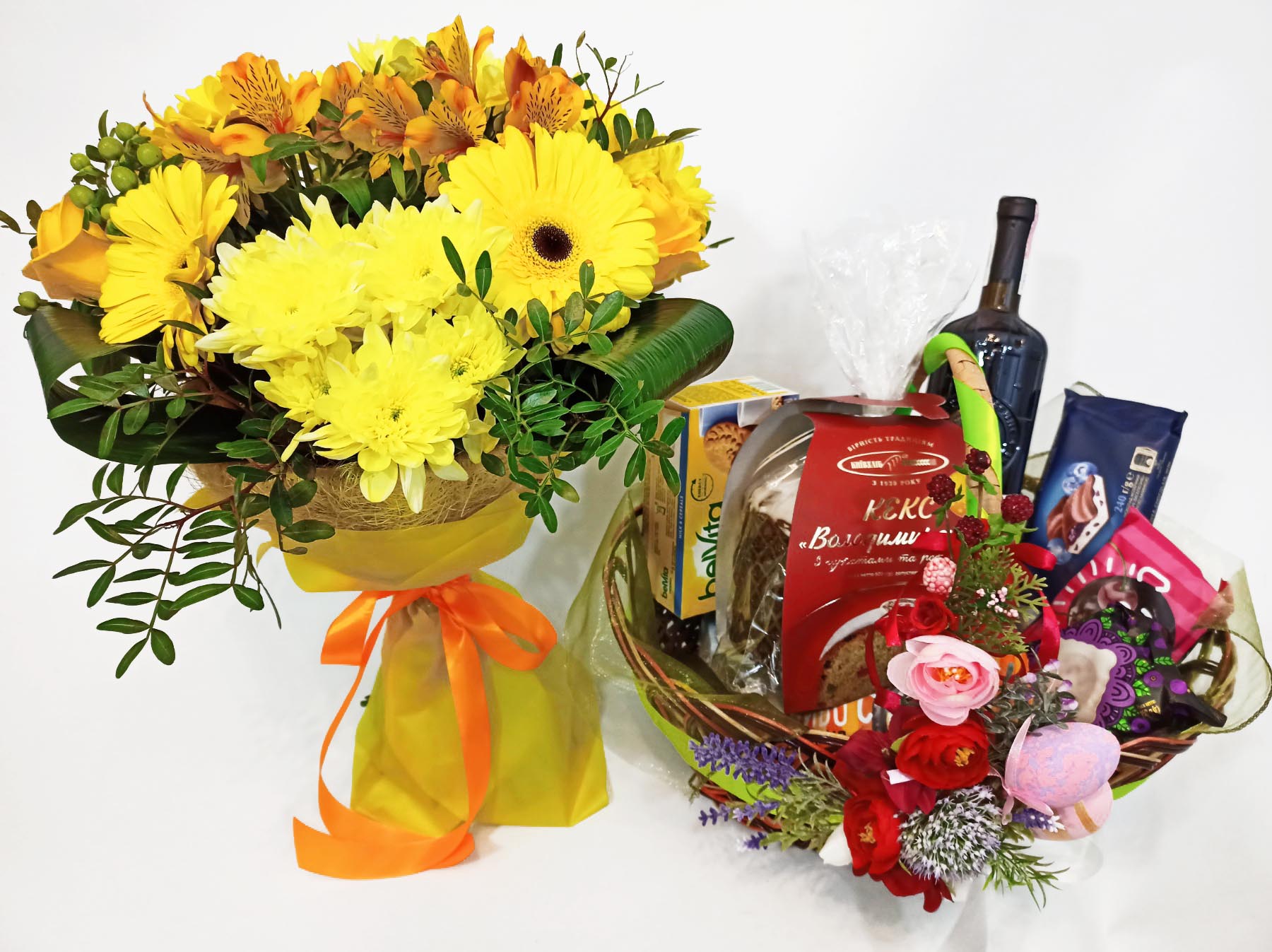 Кулич, 400-500 гр Вино Кагор, 0,7 л Печенье с начинкой в упаковке, 3 шт по 200-250 гр каждая; Плитка шоколада, 2 шт по 80 гр; Крашанки или писанки деревянные, 3 шт; Пасхальный сувенир 1 шт; Свеча для пасхи, 1 шт.