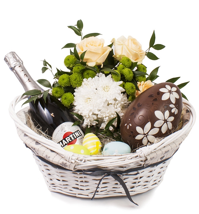Корзина с небольшим букетом свежих цветов, большим шоколадным пасхальным яйцом, шампанским Мартини Асти и парой традиционных пасхальных сувениров (декоративные или натуральные "крашанки", или др.)