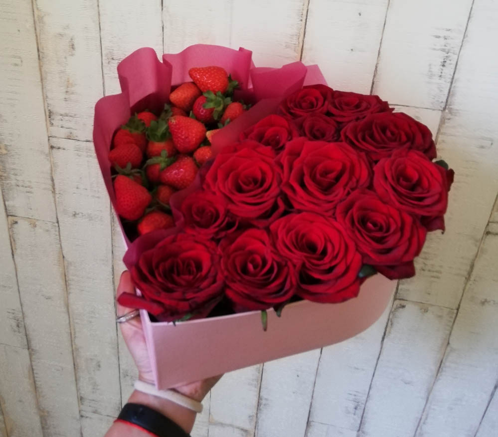 2) Средняя коробочка (как на фото) : 13 роз + 600 гр клубники