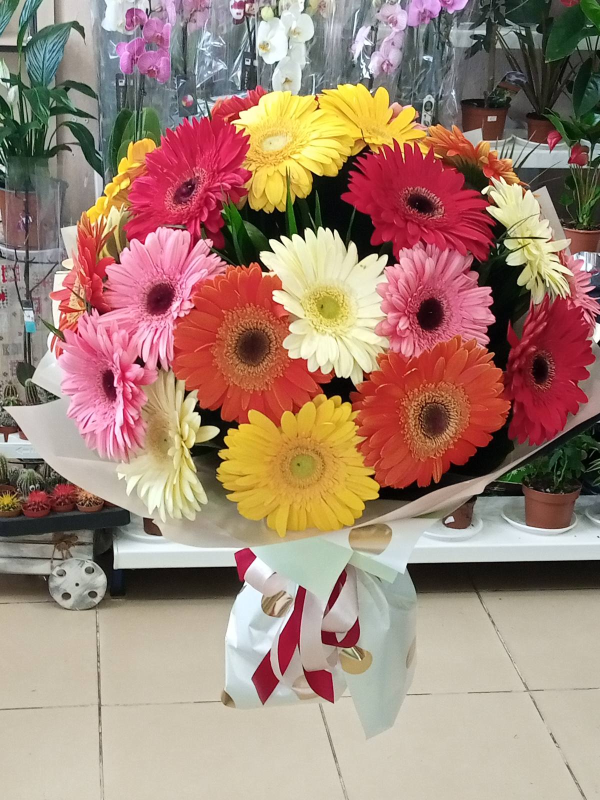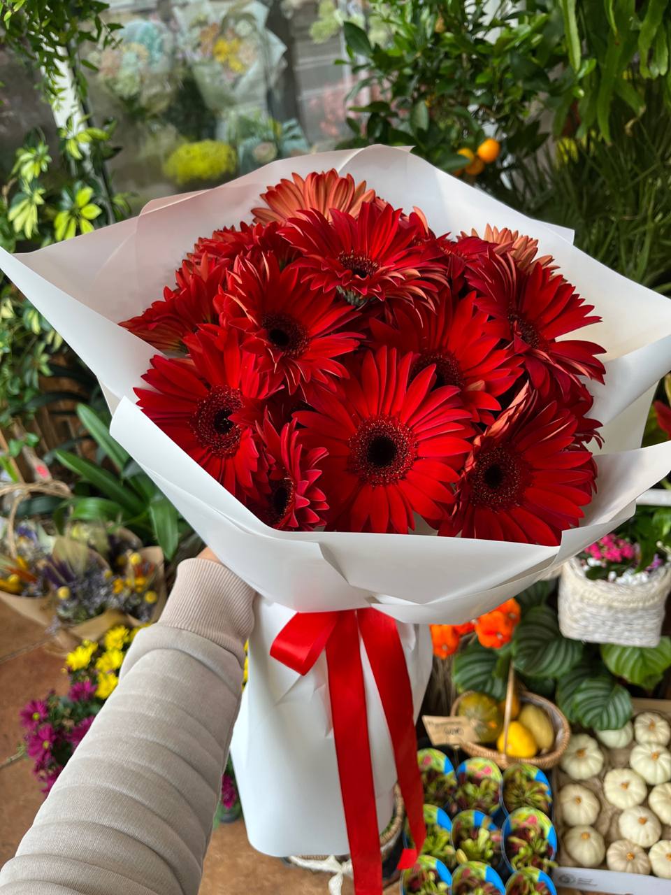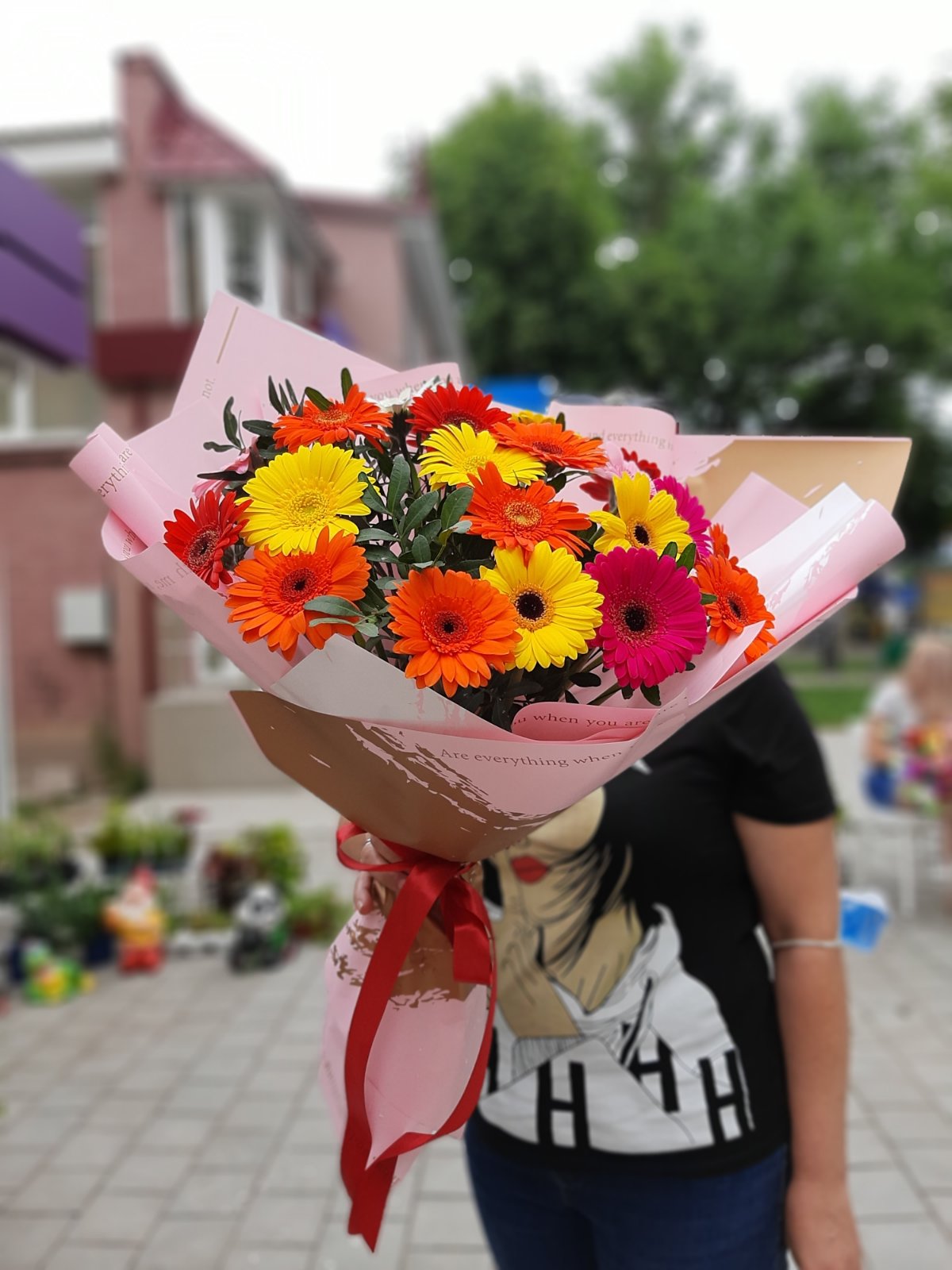 На нашем фото представлен букет из 25 гербер, но вы можете выбрать и другое их количество.