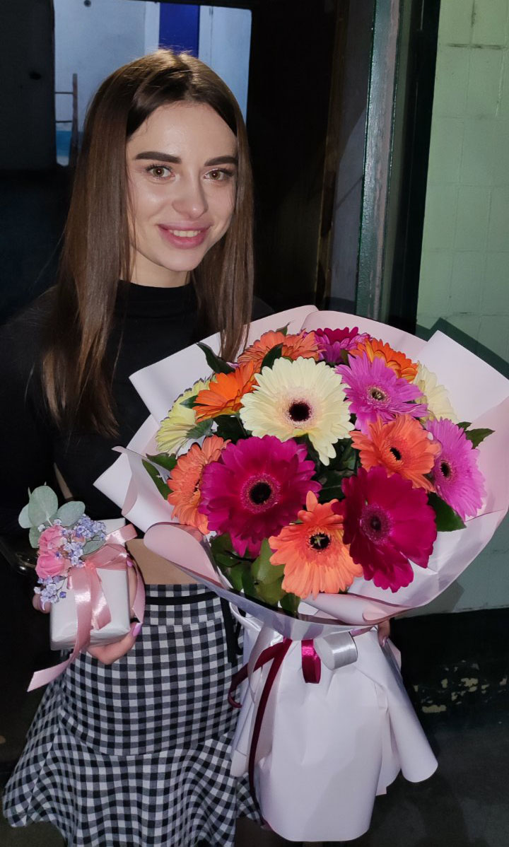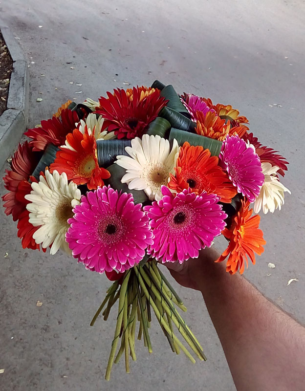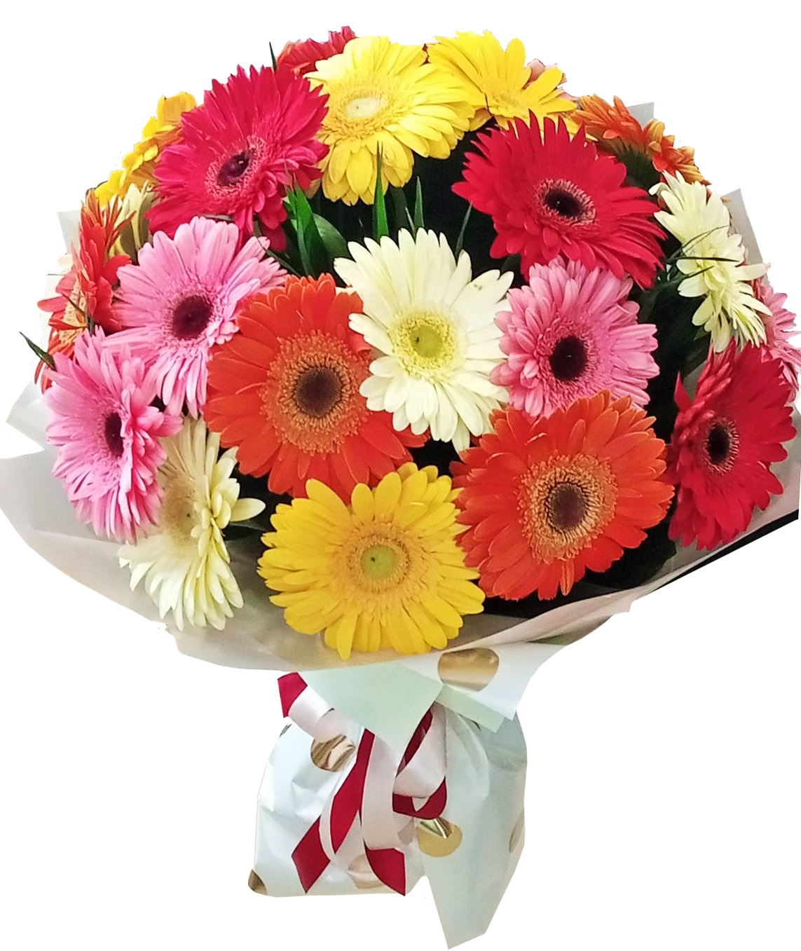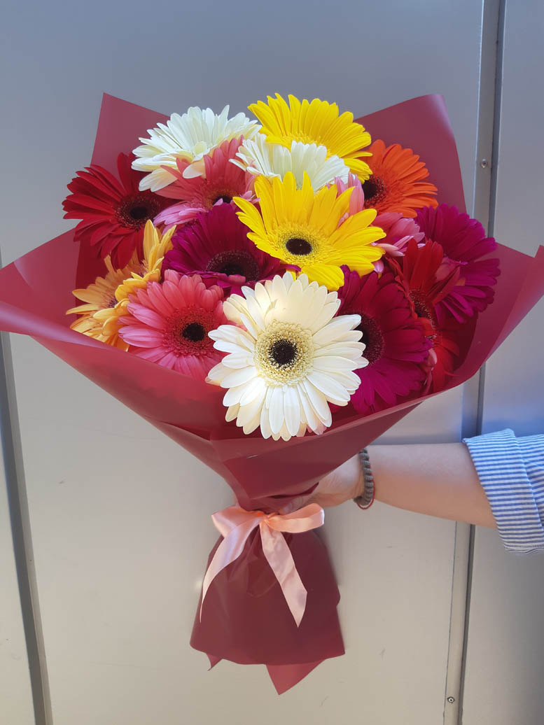 На нашем фото представлен букет из 25 гербер, но вы можете выбрать и другое их количество.