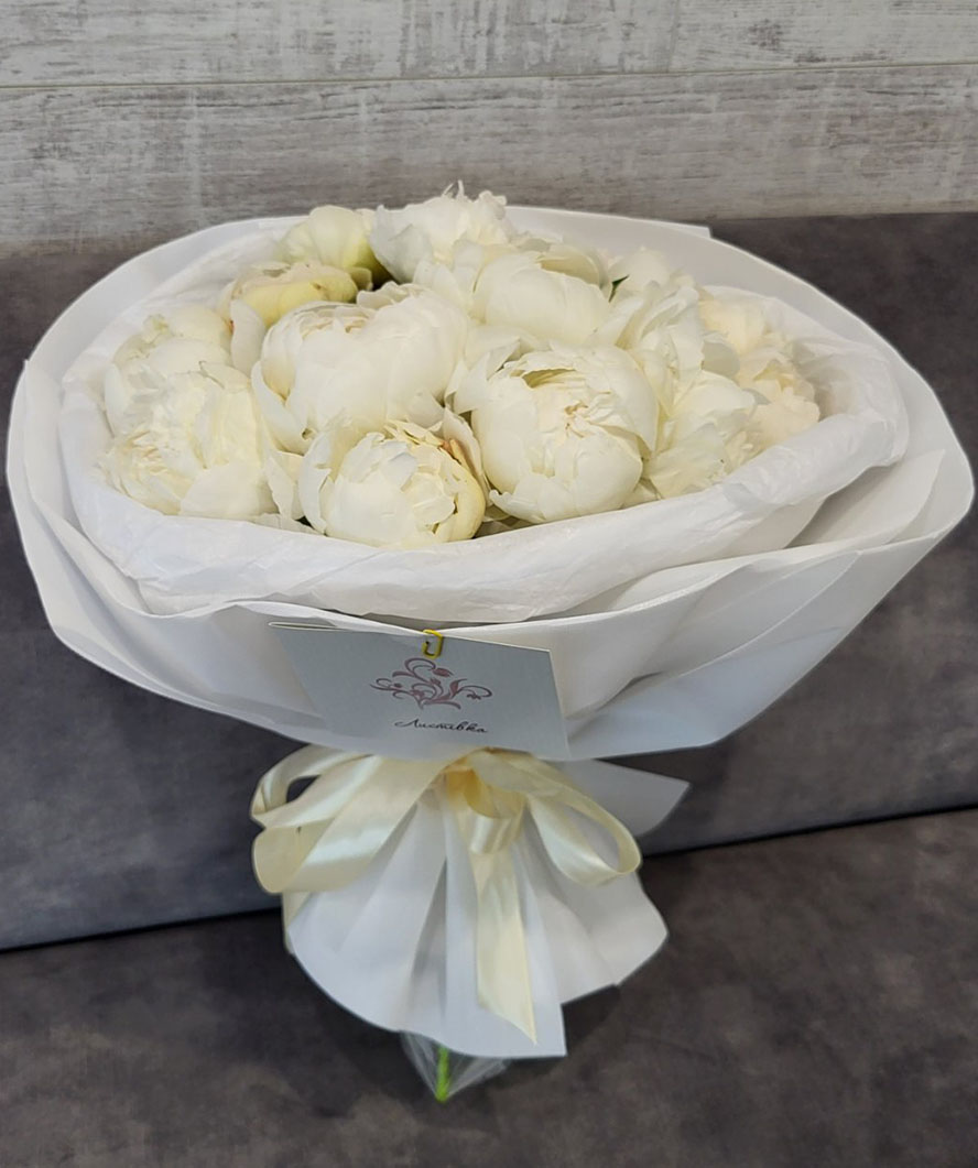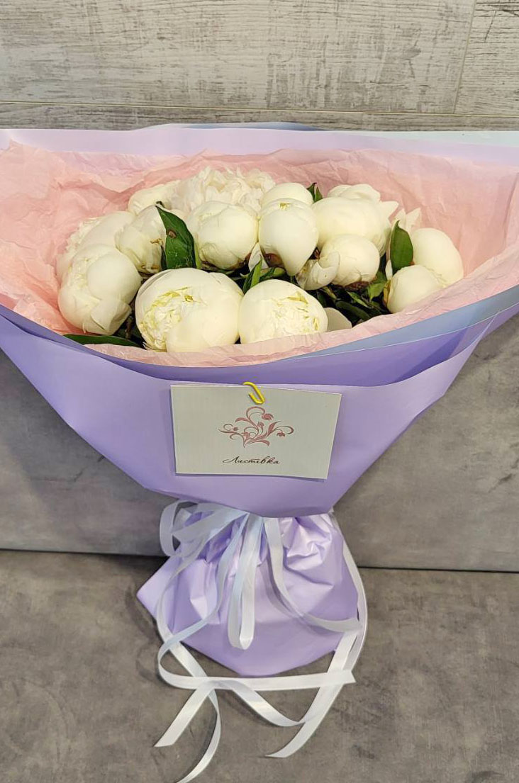 На нашей фотографии изображен букет из 15 белых пионов, но вы можете выбрать другое их количество для своей композиции. Для презентации букет, конечно же, будет красиво и со вкусом упакован и подвязан большим атласным бантом.