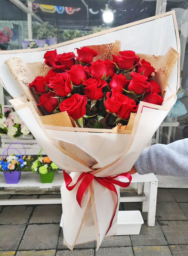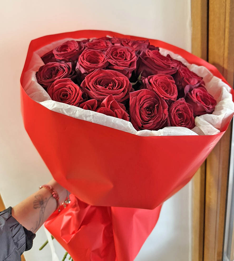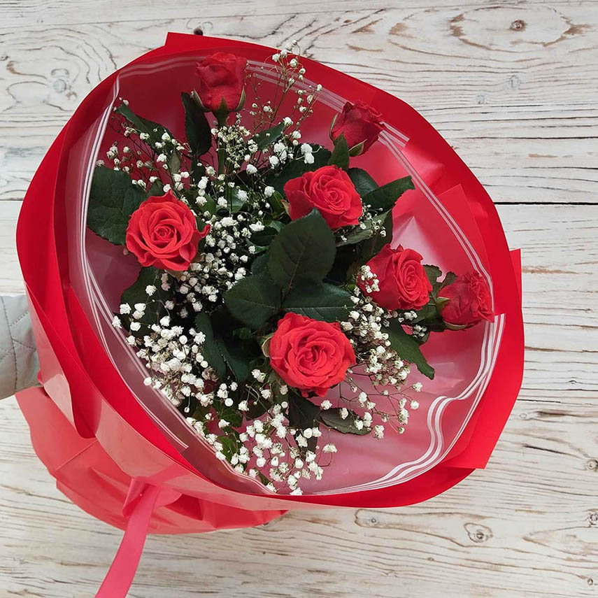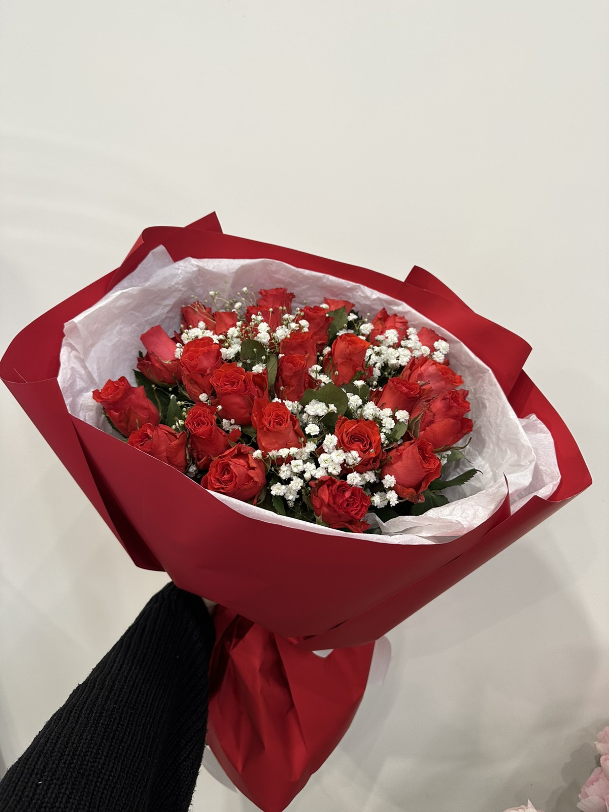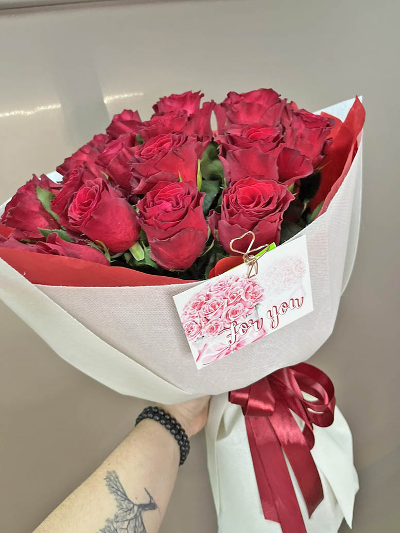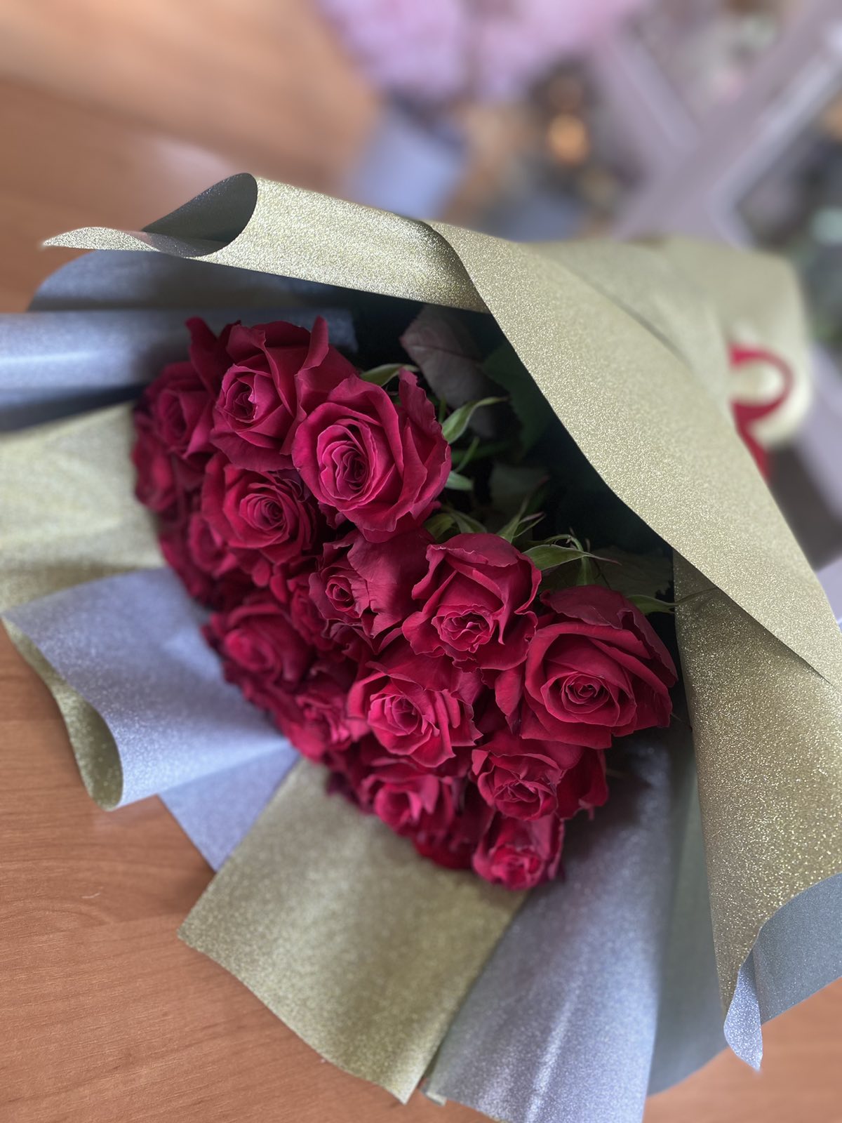 Красные розы без всяких слов скажут о ваших чувствах. Такой букет будет собран из свежайших красных роз самого лучшего качества, с длиной стебля стебля 50 - 60 см профессиональным флористом. Декоративная зелень, при наличии - белые нежные шарики гипсофилы, современная упаковка в бумагу, флористическую сетку, или флизелин, большой бант из атласной ленты - все это - элементы работы дизайнера-флориста, превращающая некое количество цветов в произведение искусства.