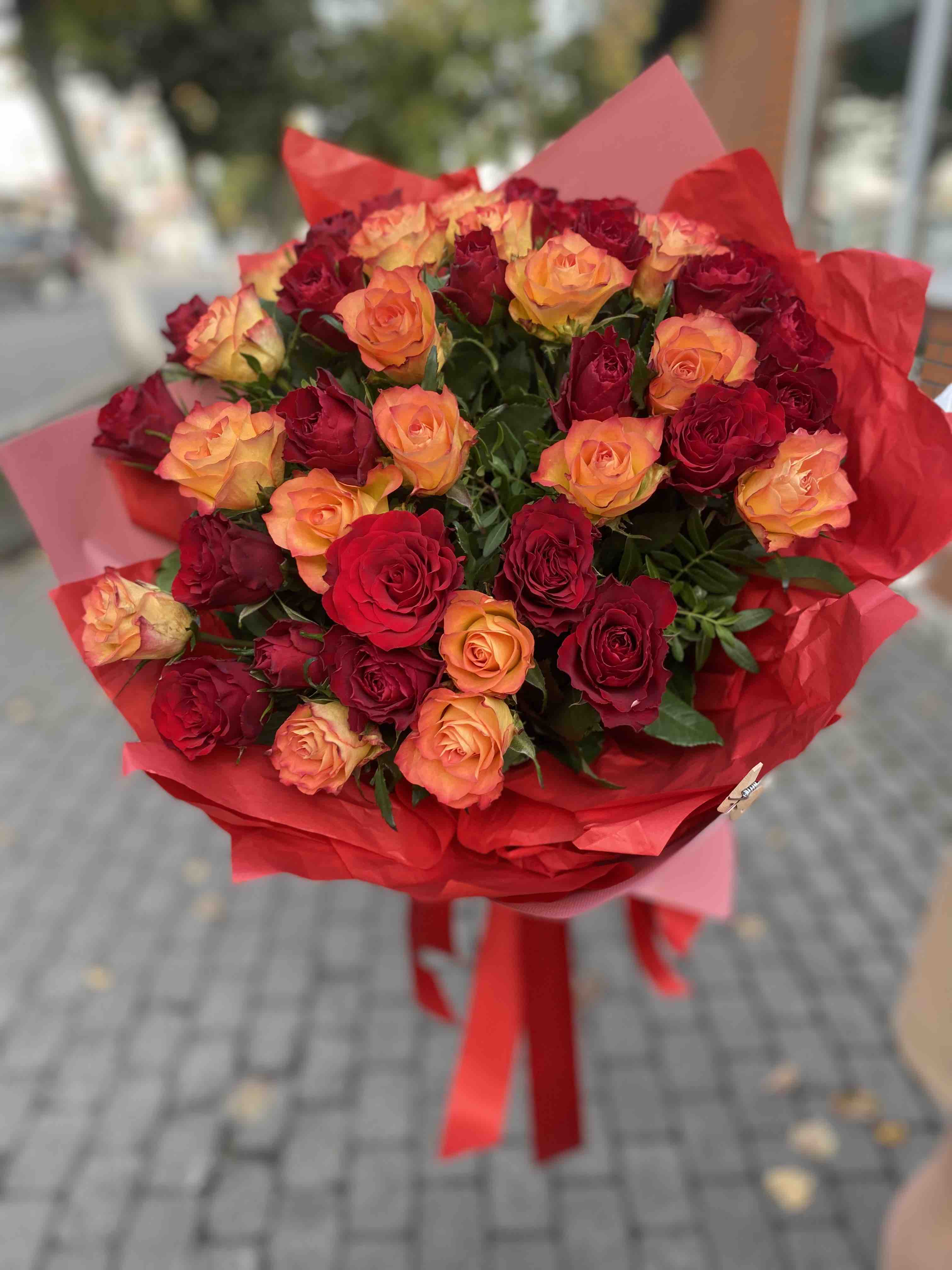 Этот букет так и излучает тепло, жгучее желание защитить, уберечь от всех ветров и гроз, любовь и страсть. Именно эти чувства вы и хотели бы выразить? Тогда скорее шлите этот букет!