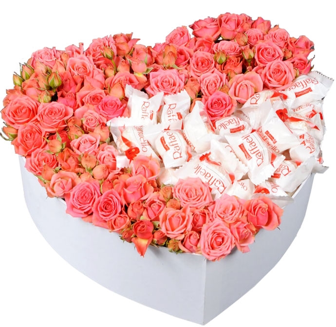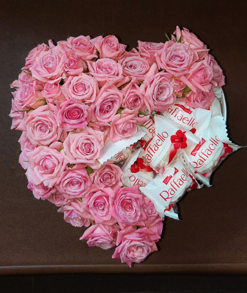 Очаровательная композиция из розовых кустовых роз и нежных конфет Raffaello, так обожаемых всеми, без преувеличения!!