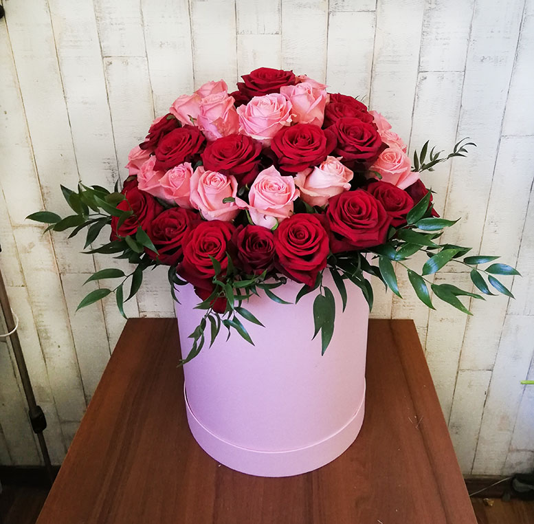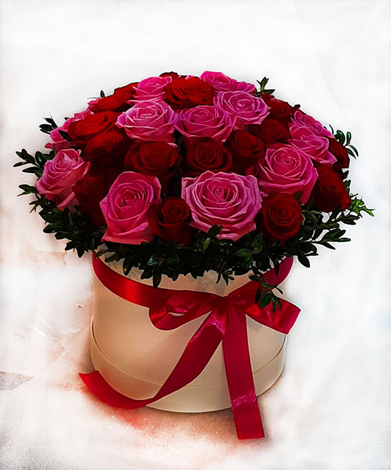 Необыкновенно красивая и эффектная композиция из красных и розовых роз. Особый шарм придает супер-современное оформление - в шляпной корзине.
