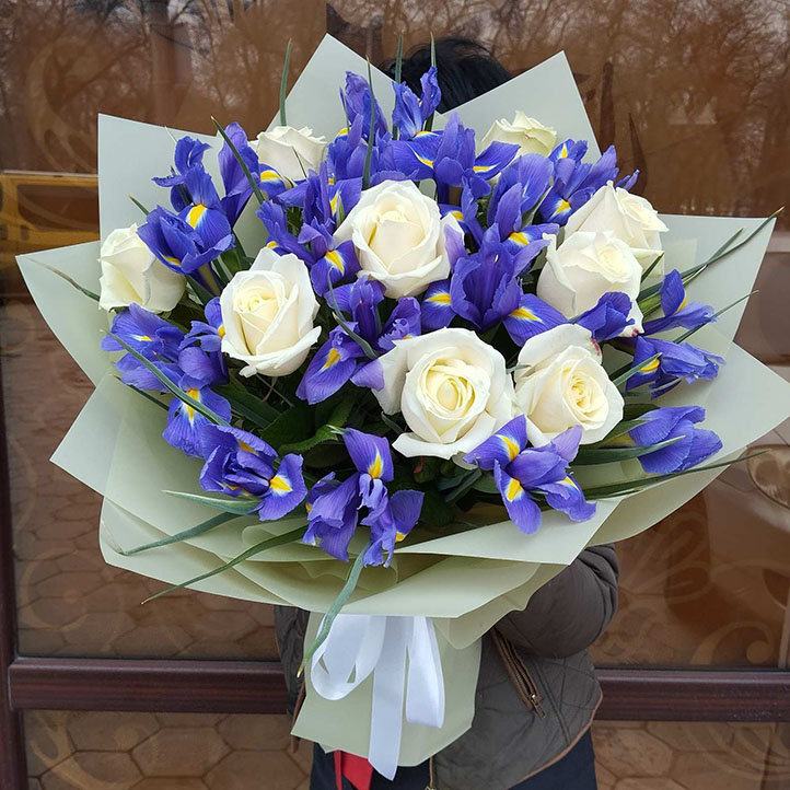Букет из белых роз и синих ирисов