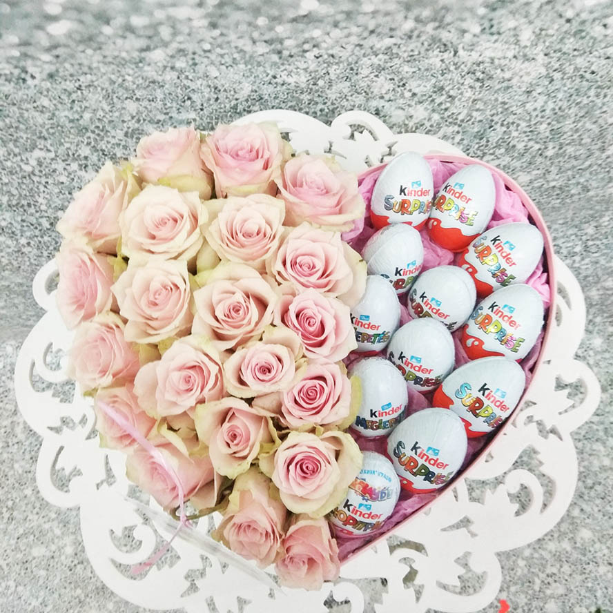 Композиция в форме сердца из розовых роз и шоколадных яиц.