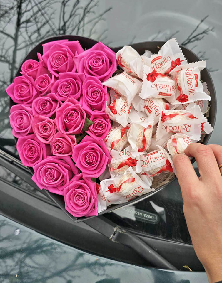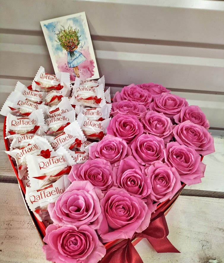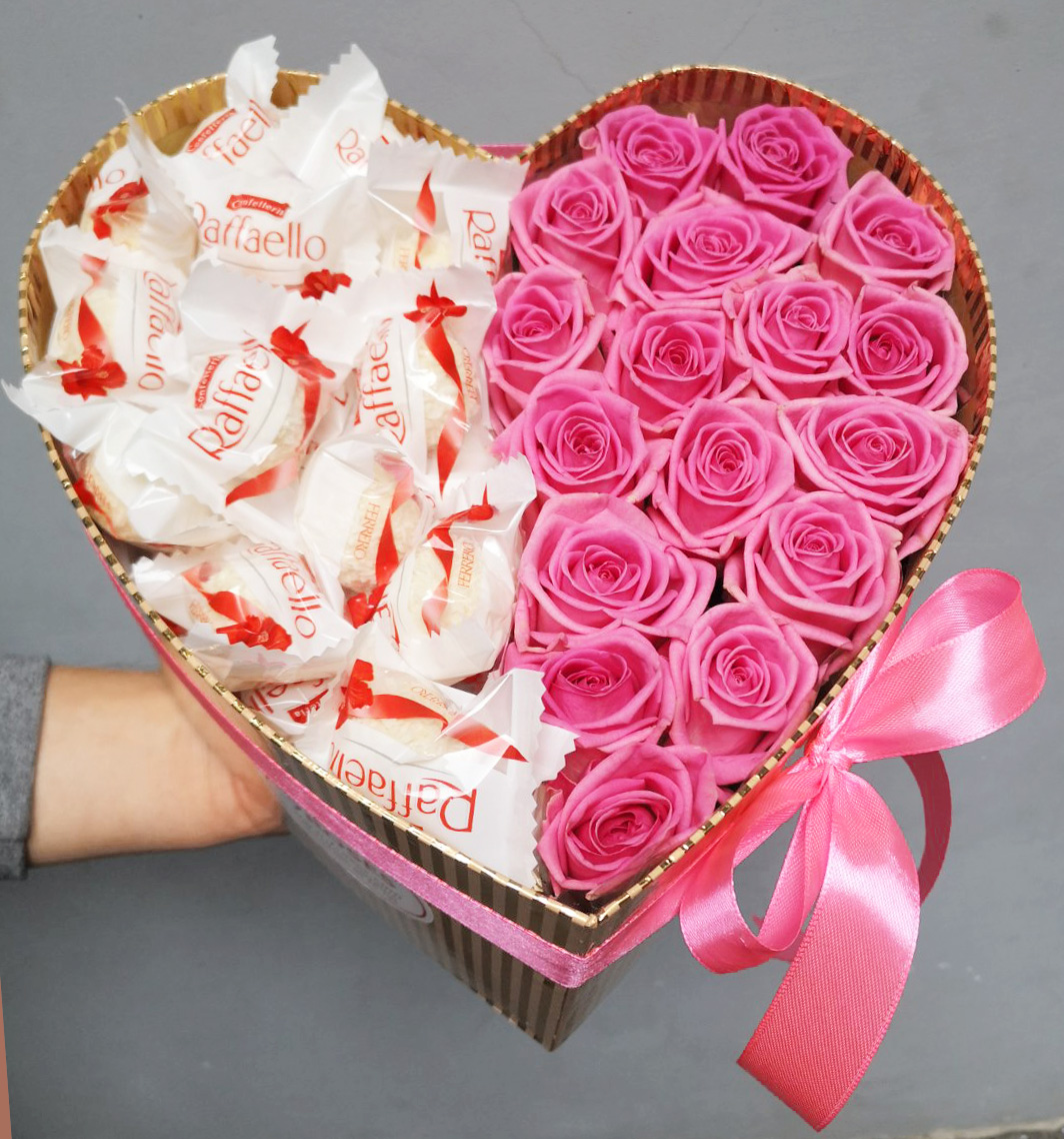 Розовые розы и божественные конфеты Raffaello в коробке в форме сердца.