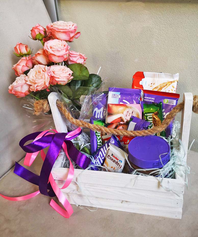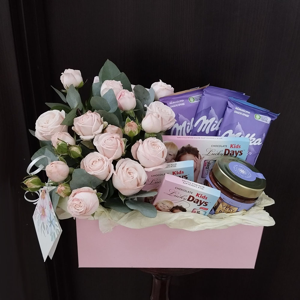 В этой композиции собрано самое главное, что обожают женщины всех возрастов: розы и много-много шоколада.