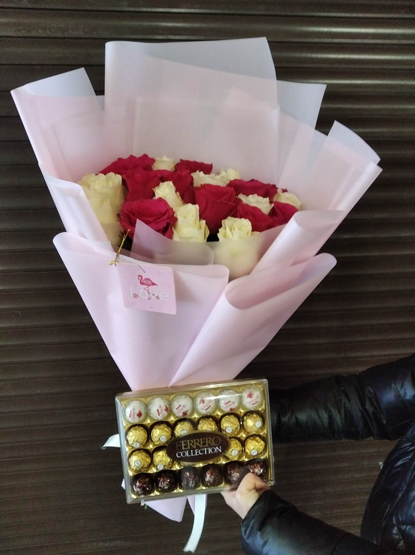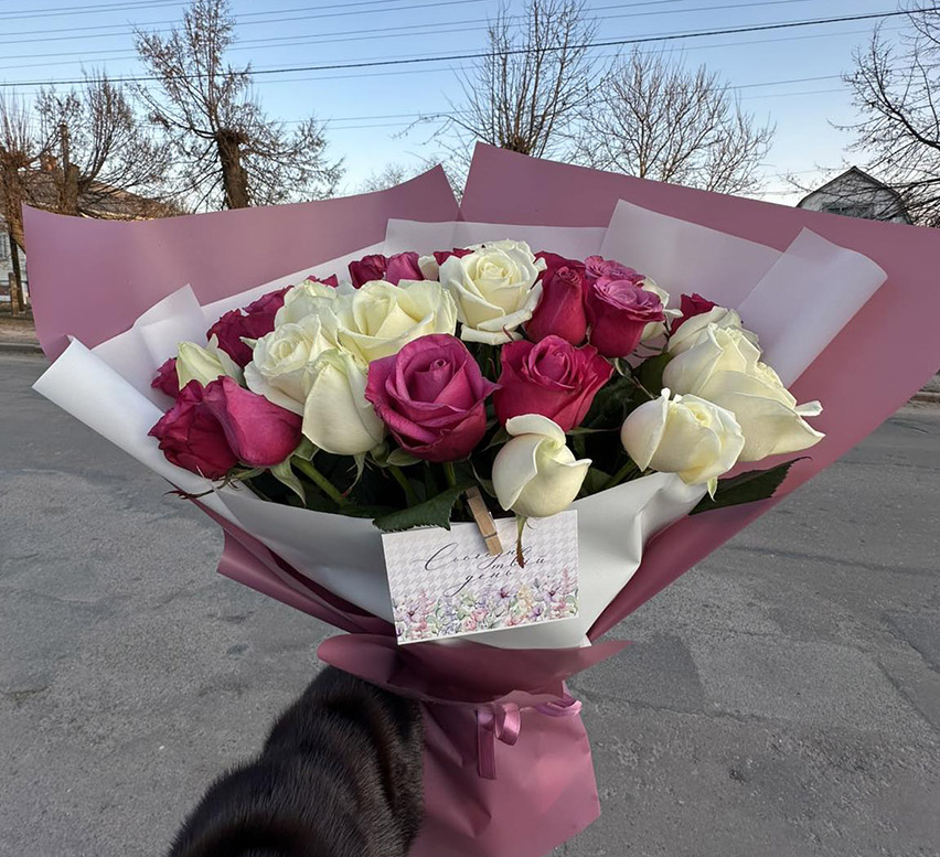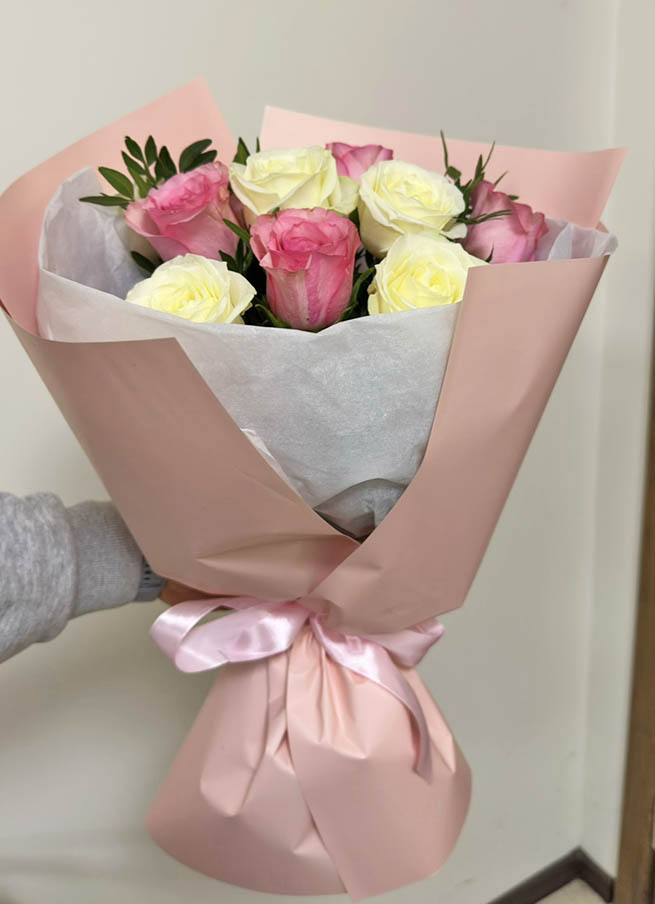 Букет белых и розовых классических роз будет красиво оформлен в современную флористическую упаковку и подвязан атласным бантом.