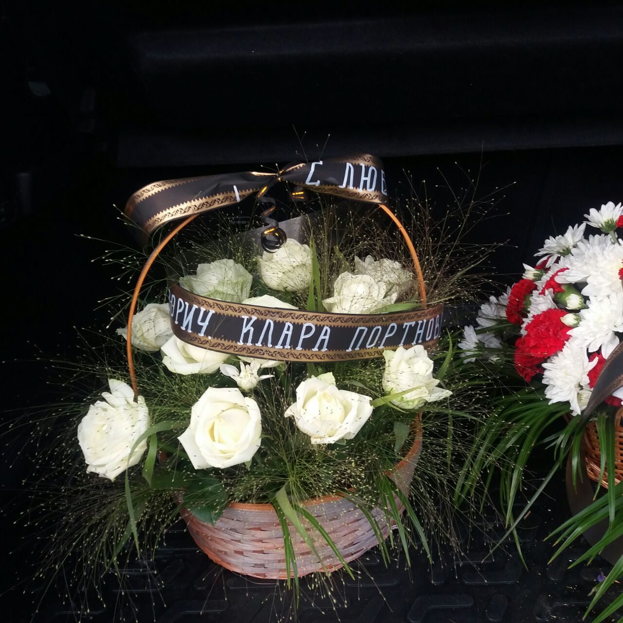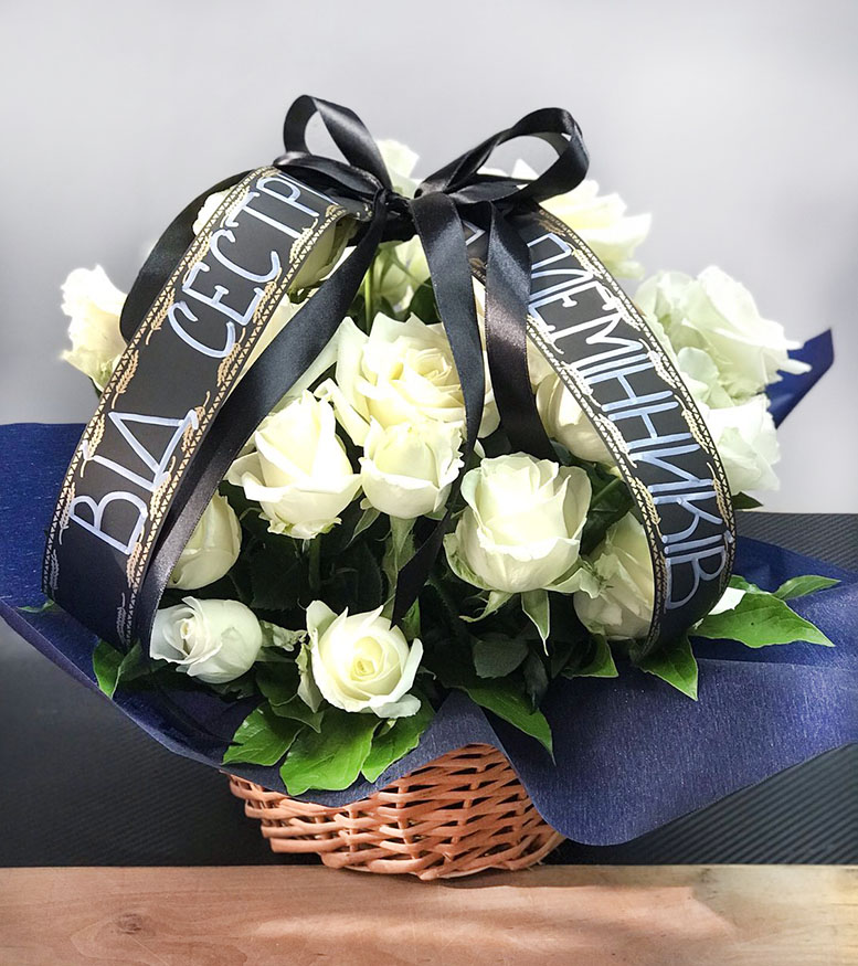 Черная траурная лента подчеркнет грустный повод доставки этого букета..