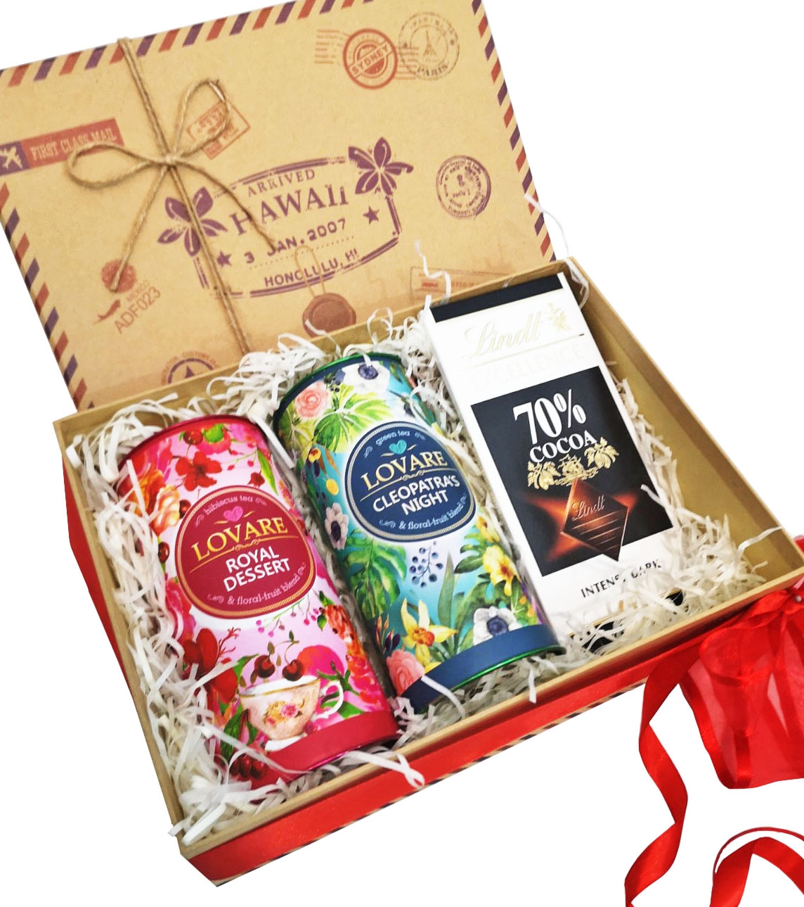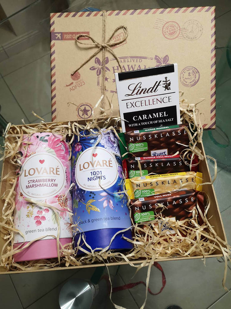 В этот набор входит очень популярный и вкусный чай серии LOVARE с разными вкусами и шоколадка одного из лучших мировых производителей. Если нам повезет - обязательно купим Lindt, если такого не будет в наличии, возьмем лучший из импортных шоколадок, имеющихся в наших местных супермаркетах.