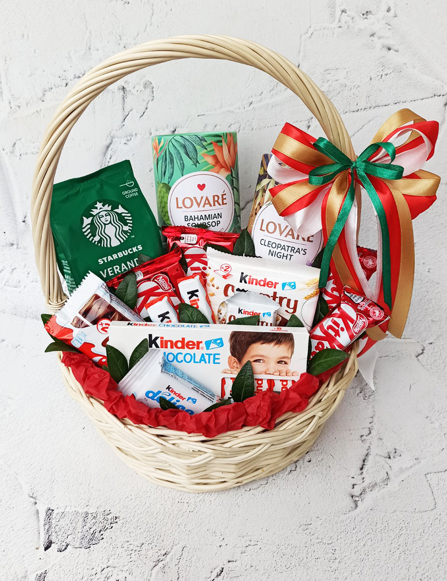 1 х Чай черный, 150-160 гр, 1 х Кофе молотый, 200 гр, 4 х Шоколадки Kit Kat 4 x Шоколадки Kinder