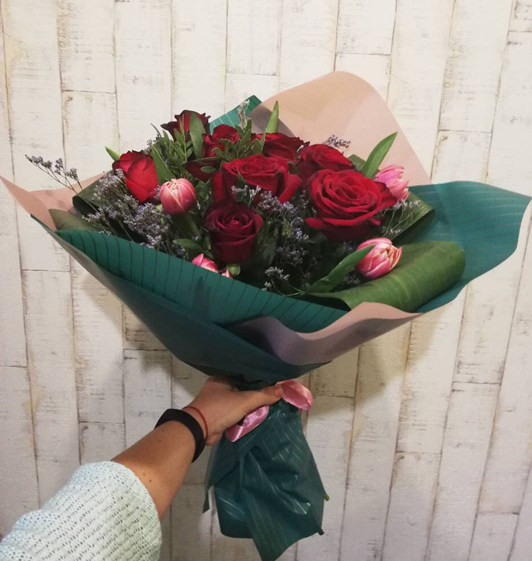 Пусть этот букет станет проводником в страну большой любви! Здесь 8 красных роз и 7 красных тюльпанов.