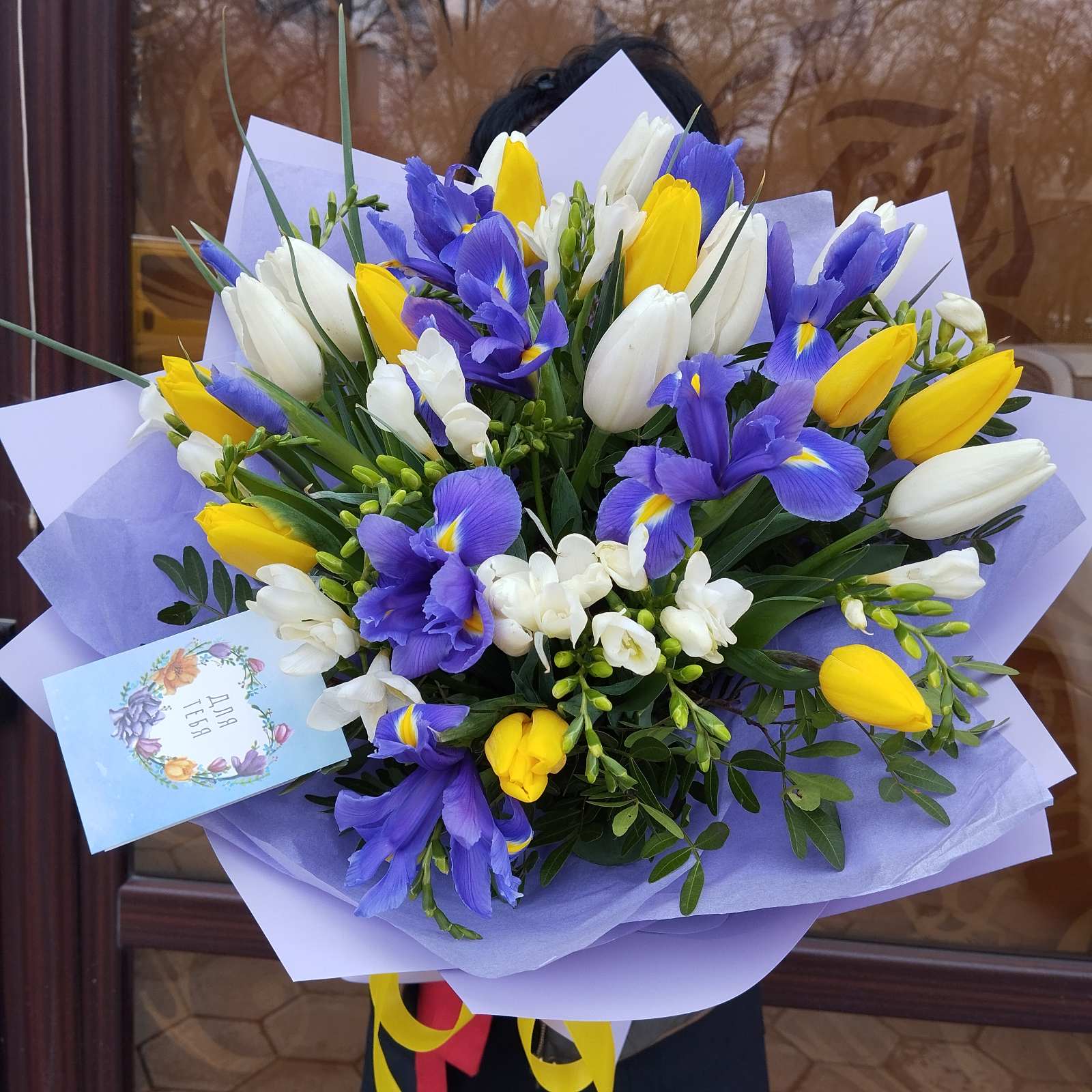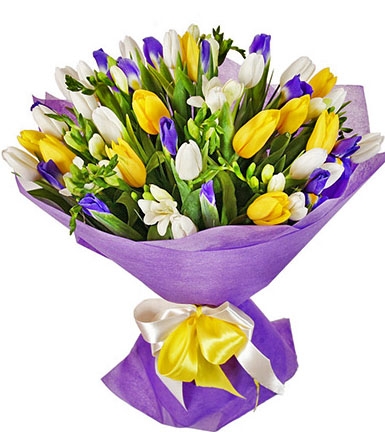 Яркий, как весеннее Солнце, букет может быть доставлен только в период примерно с января-февраля до апреля - в период цветения упомянутых весенних цветов.