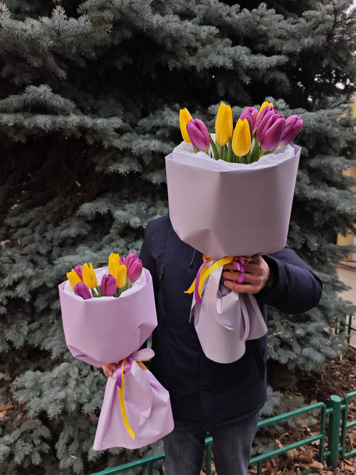 Сиреневые тюльпаны на момент вашего заказа могут быть немного другого оттенка: более или менее яркие, ближе к светло-сиреневому или наоборот - к более темному и насыщенному фиолетовому цвету. В разные поставки нам приходят немного разные тюльпаны.