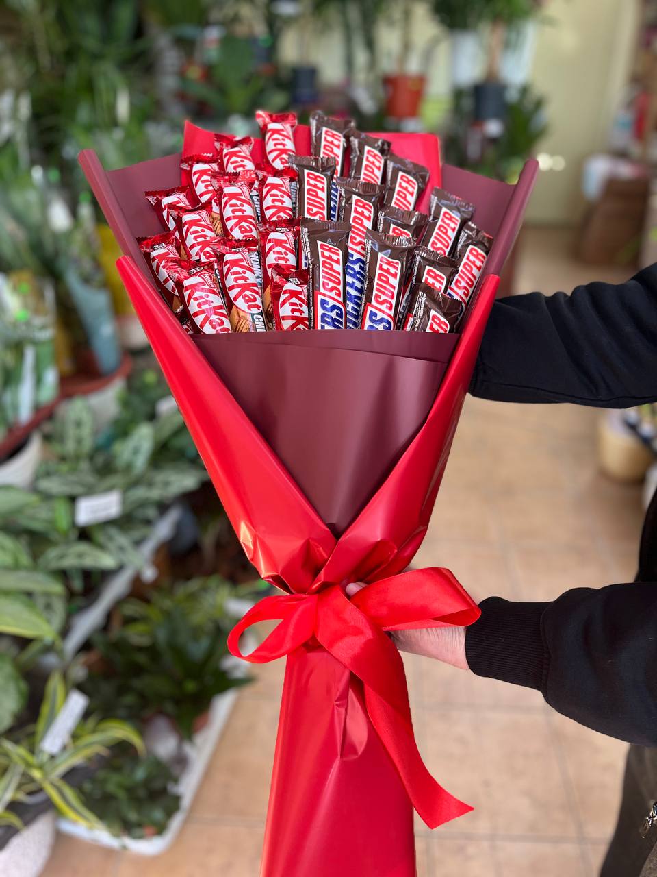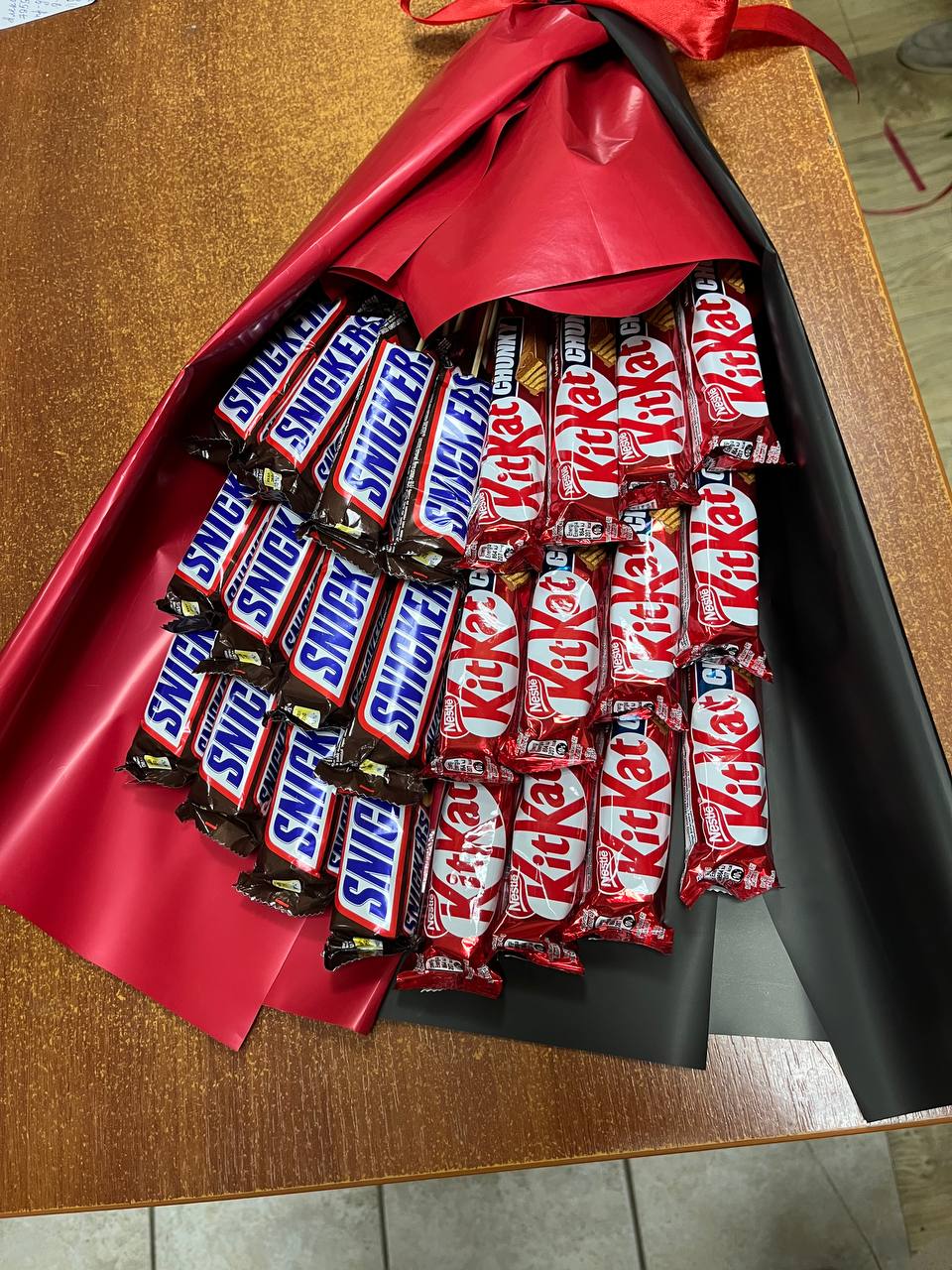 Fansy arranged sweet chocolate bouquet consists of red Kit-Kat and black Snickers.