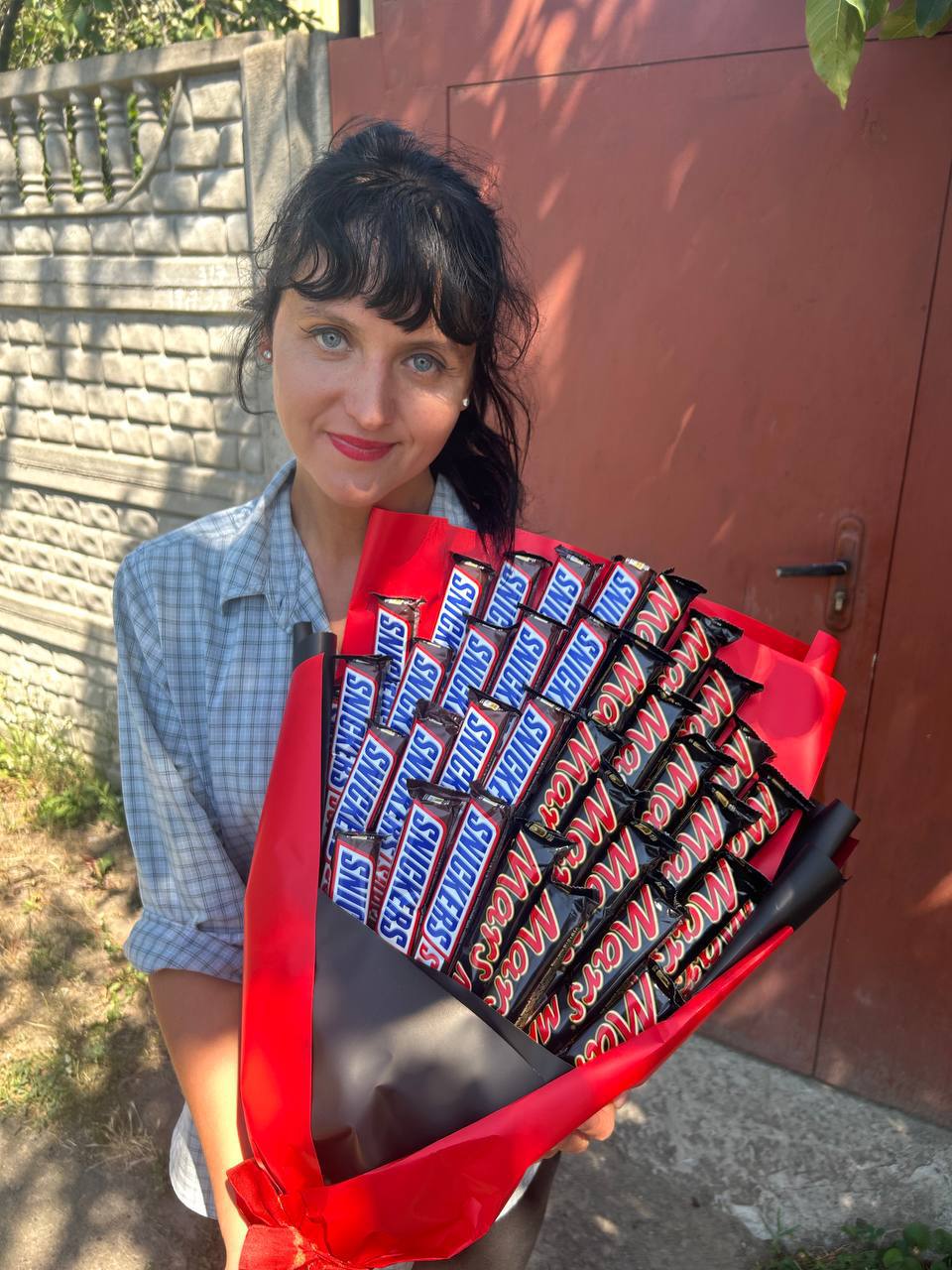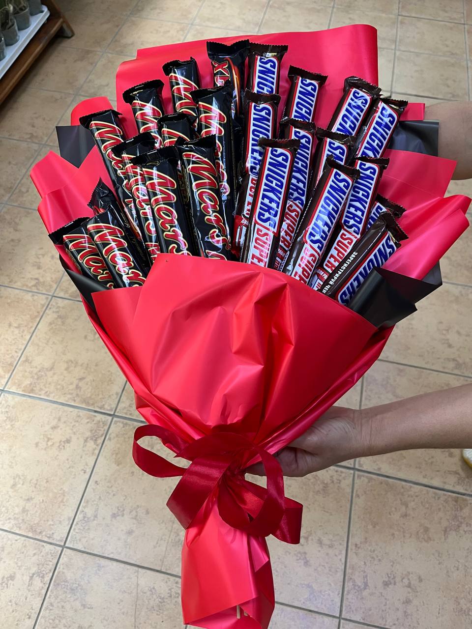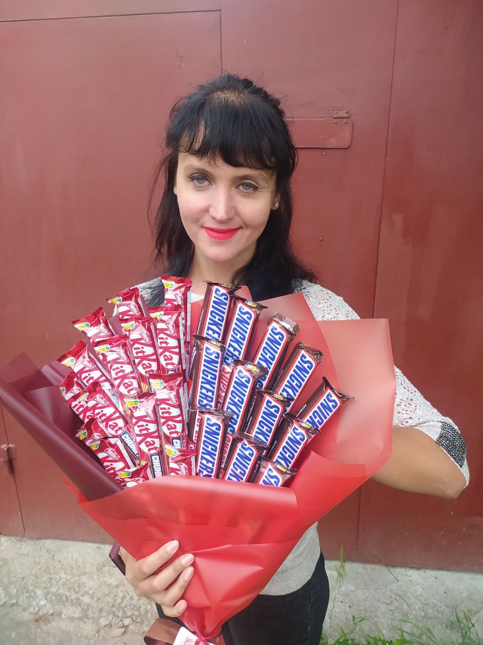 Our photo shows a lage option of the bouquet (25 Kit-Kat and 25 Snickerses), but you could select a smaller one for your gift.