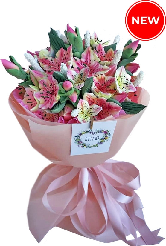 The price of a bouquet is determined by its size, or rather, the diameter of its base. For example, This bouquet at our photo is of a "Small" size, the base diameter of the alstroemerias bouquet is only 16 cm base. Although if you measure the bouquet itself (flowers) is 22 cm! Actually all bouquets size on the top is larger than their bazes, however the size of the increase always depends on which flowers make up the bouquet.