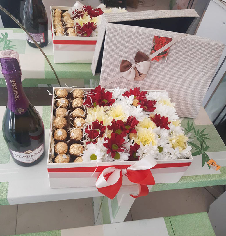 Chrysanthemums - the flowers which are long time fresh amd live and colorful. These chrysanthemums are set in a special oasis that keeps them fresh keep their owner in good mood. Ferrero..? They will disappear much earlier:)