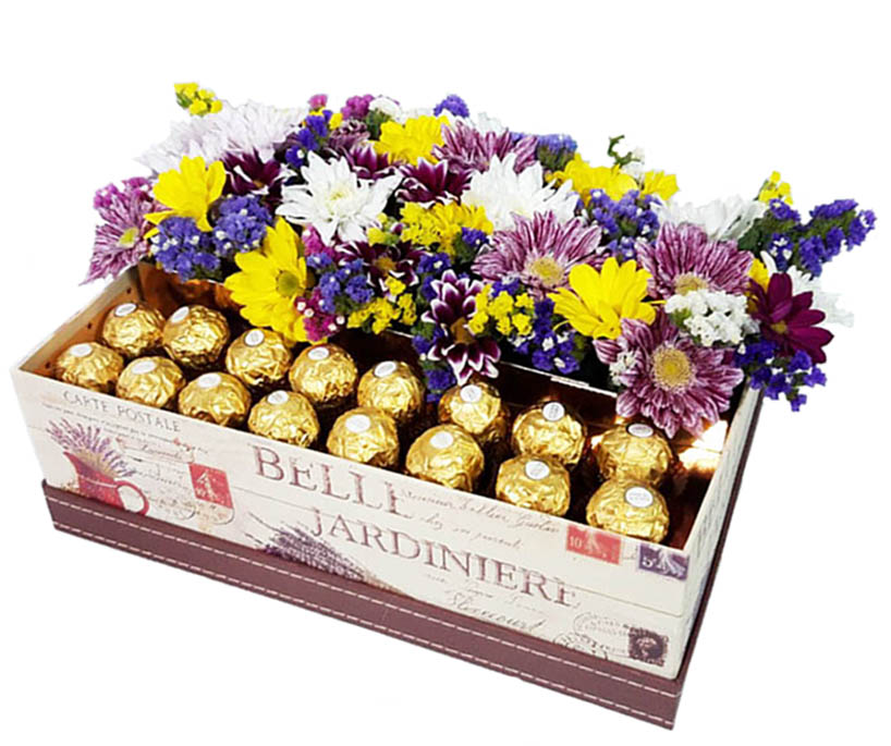 This gift box with a satin bow includes chrysanthemums: yellow, red, white...and 2 rows of heavenly delicious Ferrero Rocher chocolate candies in golden wrapping