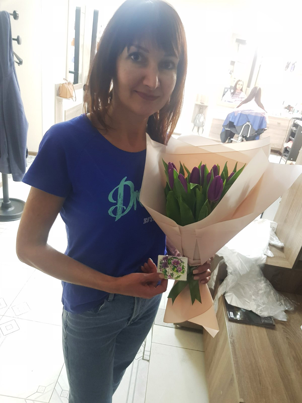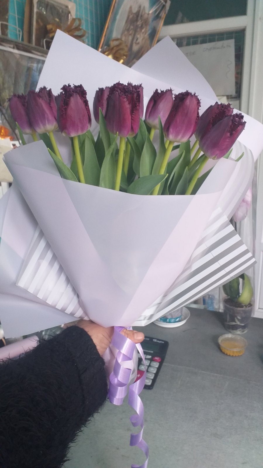 Our photo shows 51 tulips bouquet, but you could choose any other number of flowers for your bouquet.