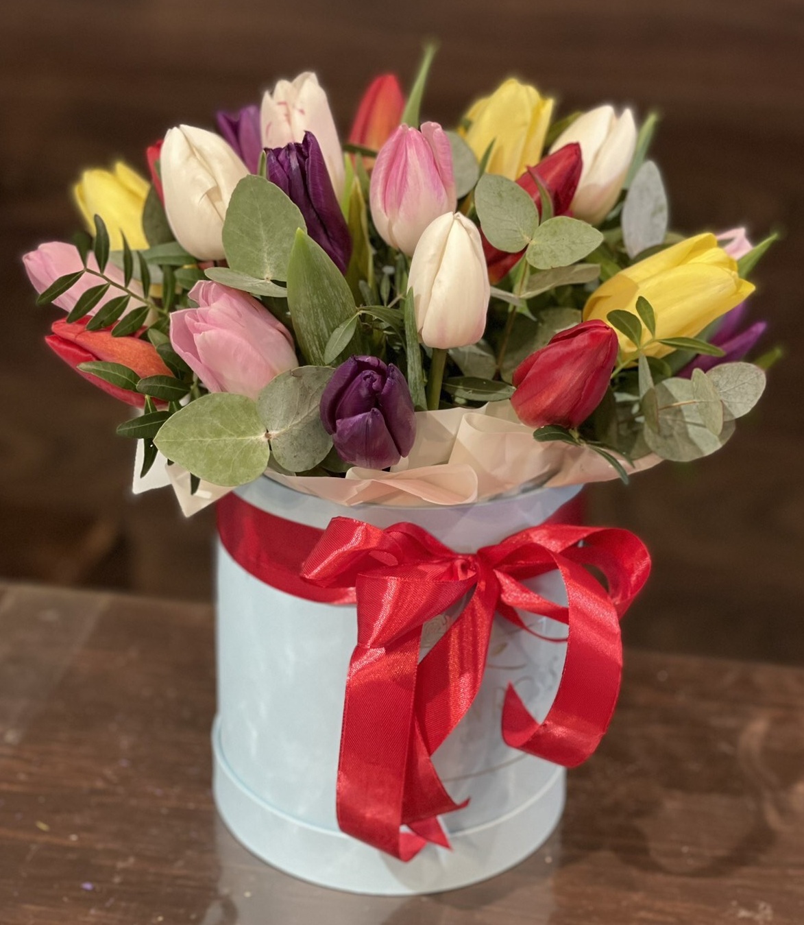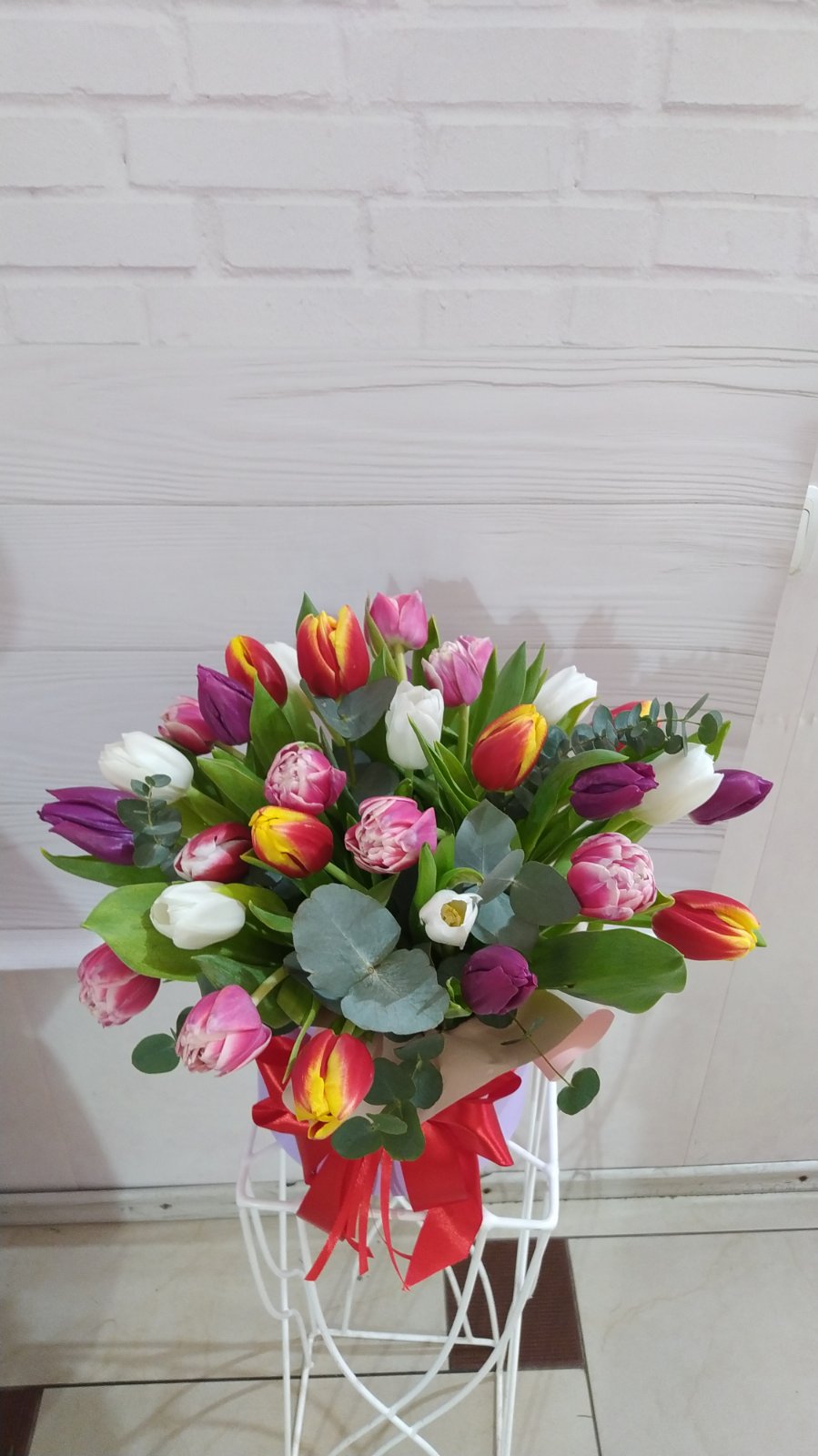 Our photo shown 27 multicolored Tulips arrangement, but we offer a smaller and bigger option.