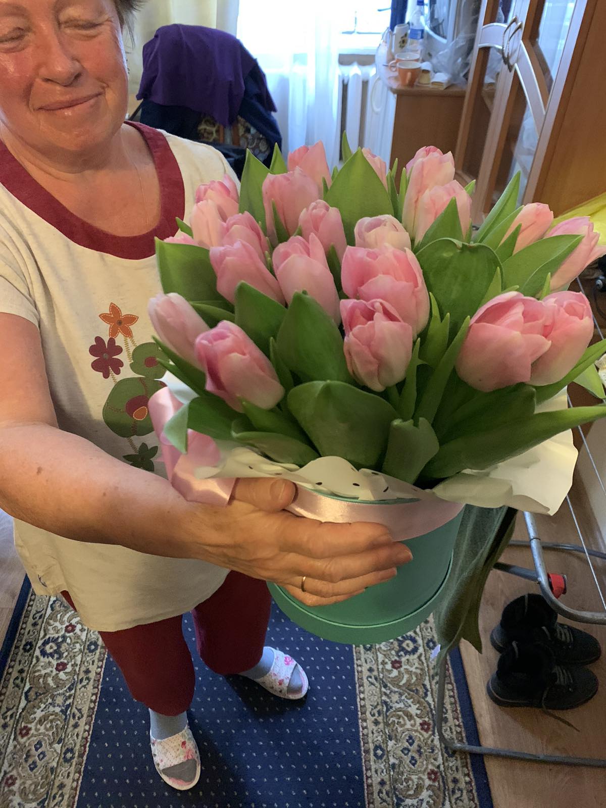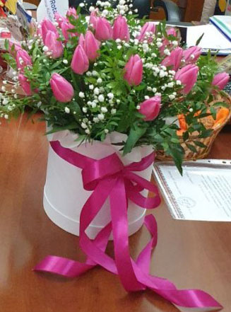 The "Pink" tulips color can be more or less bright than at our photo. It depends on the sort of flowers that arrive from suppliers at the moment.