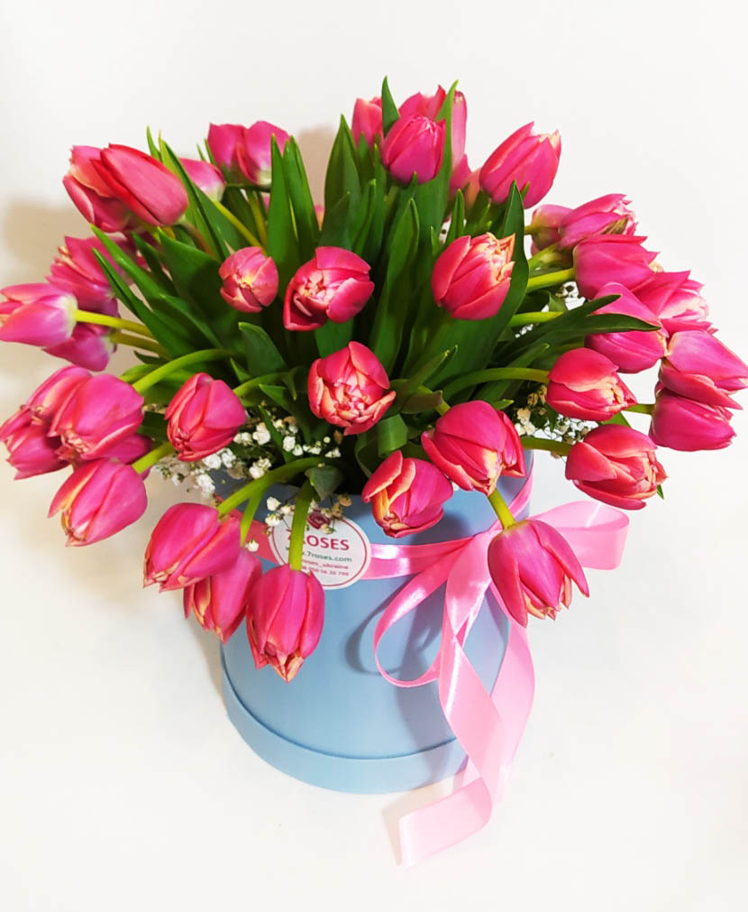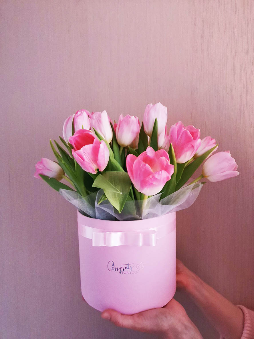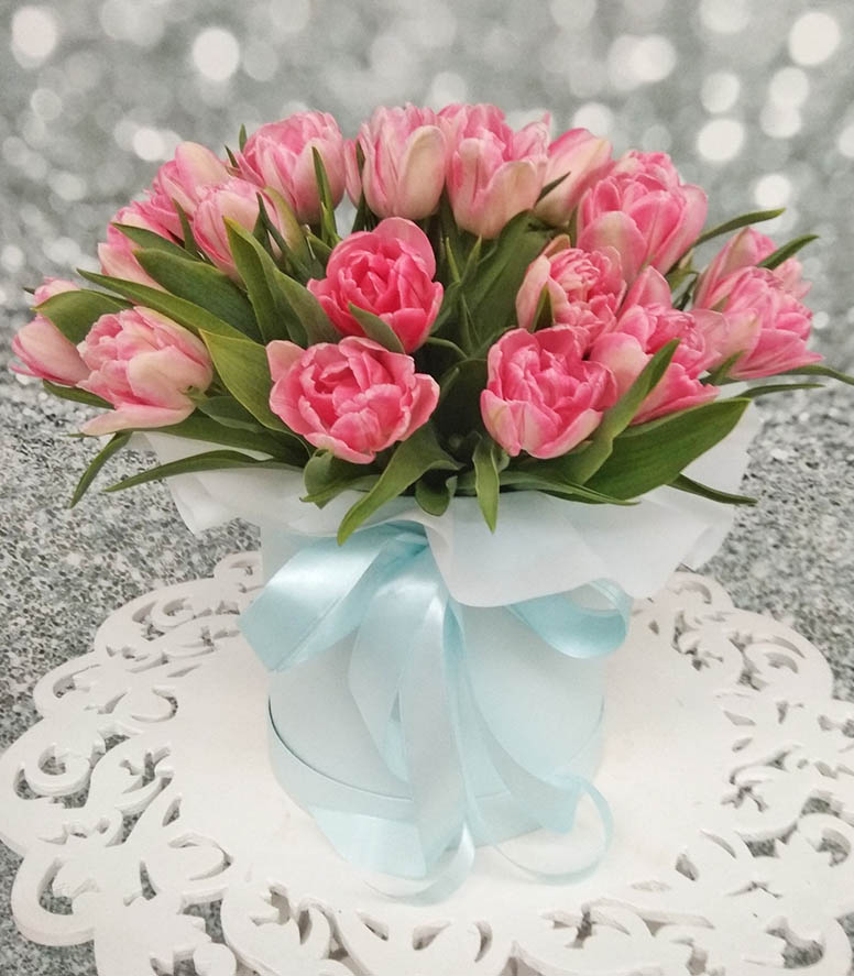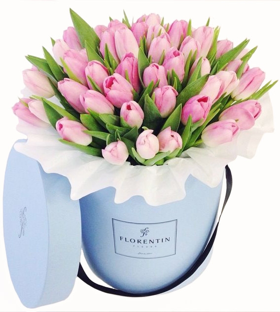 The photo shows arrangement of 51 light pink tulips at a hat box. Please, choose the number of tulips for your box.
