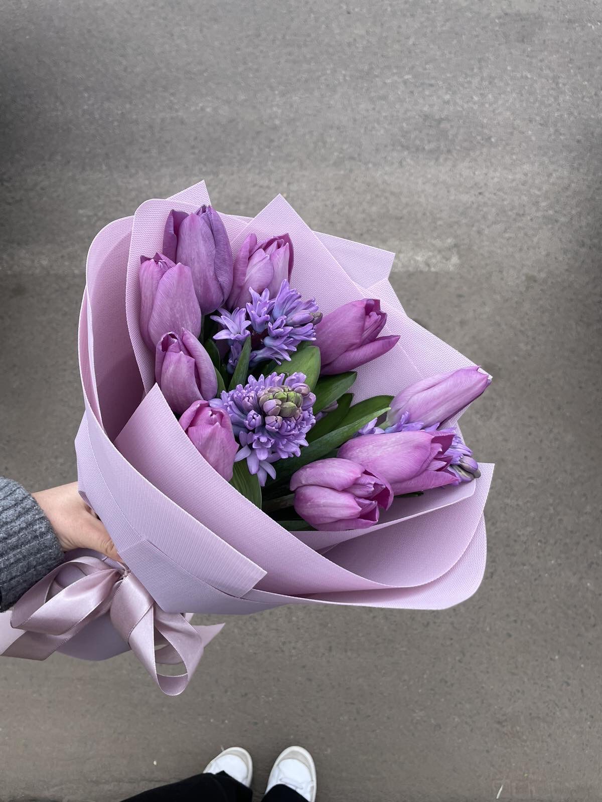 Our photo shows a "Medium" bouquet with 20 tulips and 5 hyacinths. However a smaller as well as larger one can be ordered. Pleaes, make your choice.