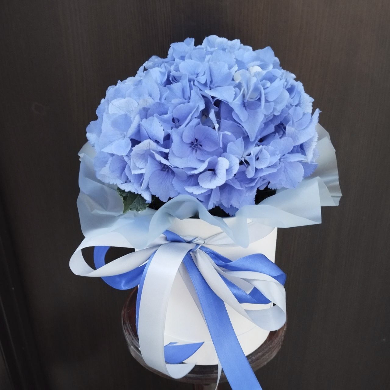 Композиція з синьо-фіолетової гортензії у коробці.