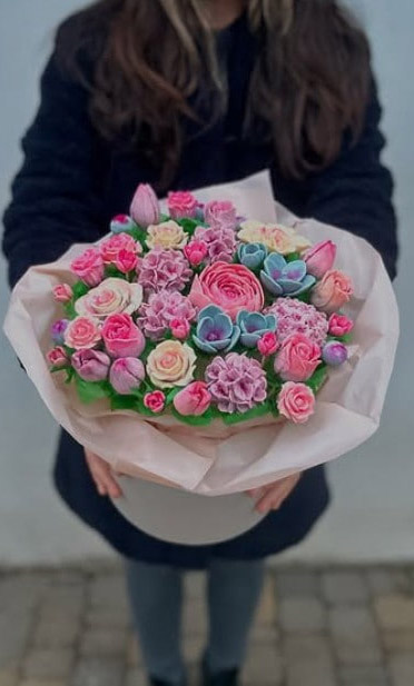 Воістину неймовірний подарунок! Мікс квітів, величезна різноманітність їх видів та відтінків. До речі, всі фарби повністю натуральні, отримані з овочів, фруктів і ягід. Композиція робиться в капелюшній коробці - так само, як оформляються живі квіти.