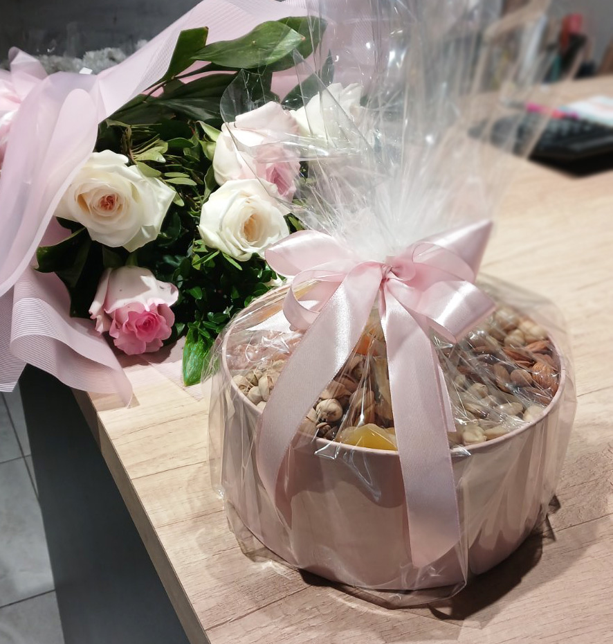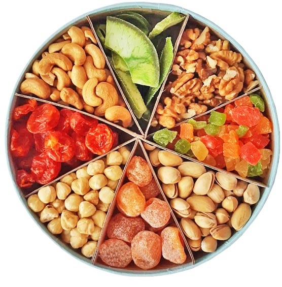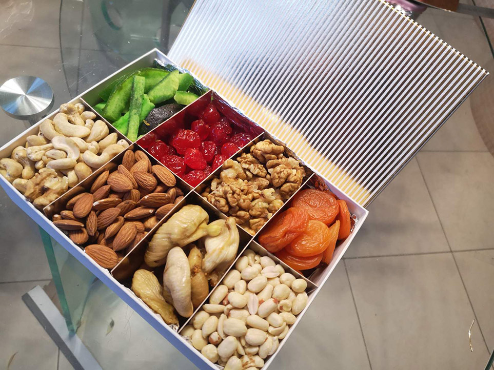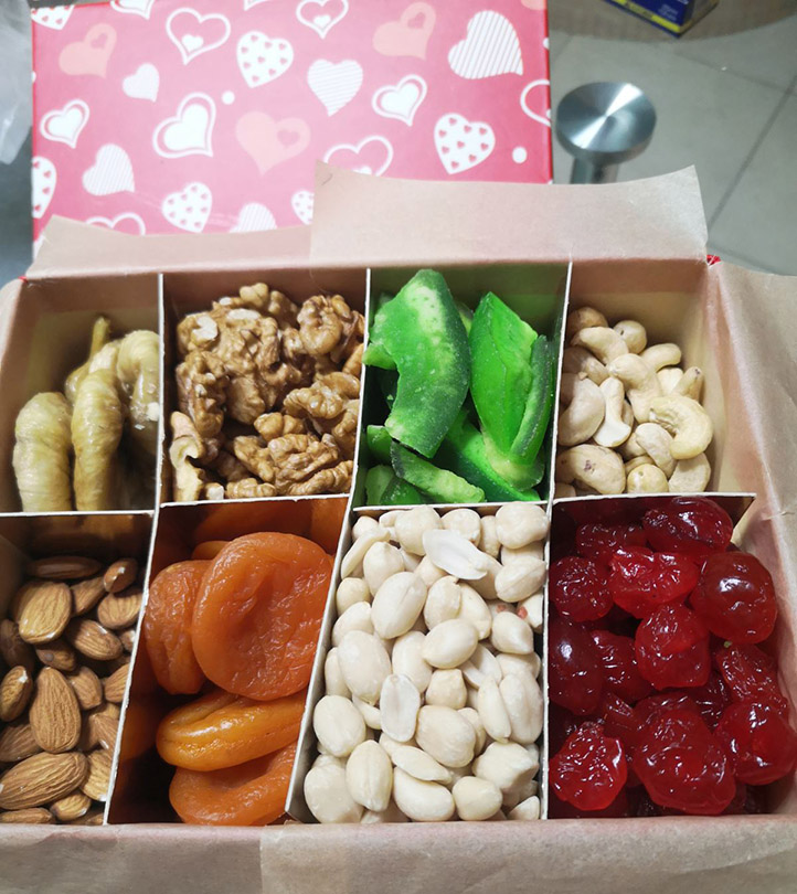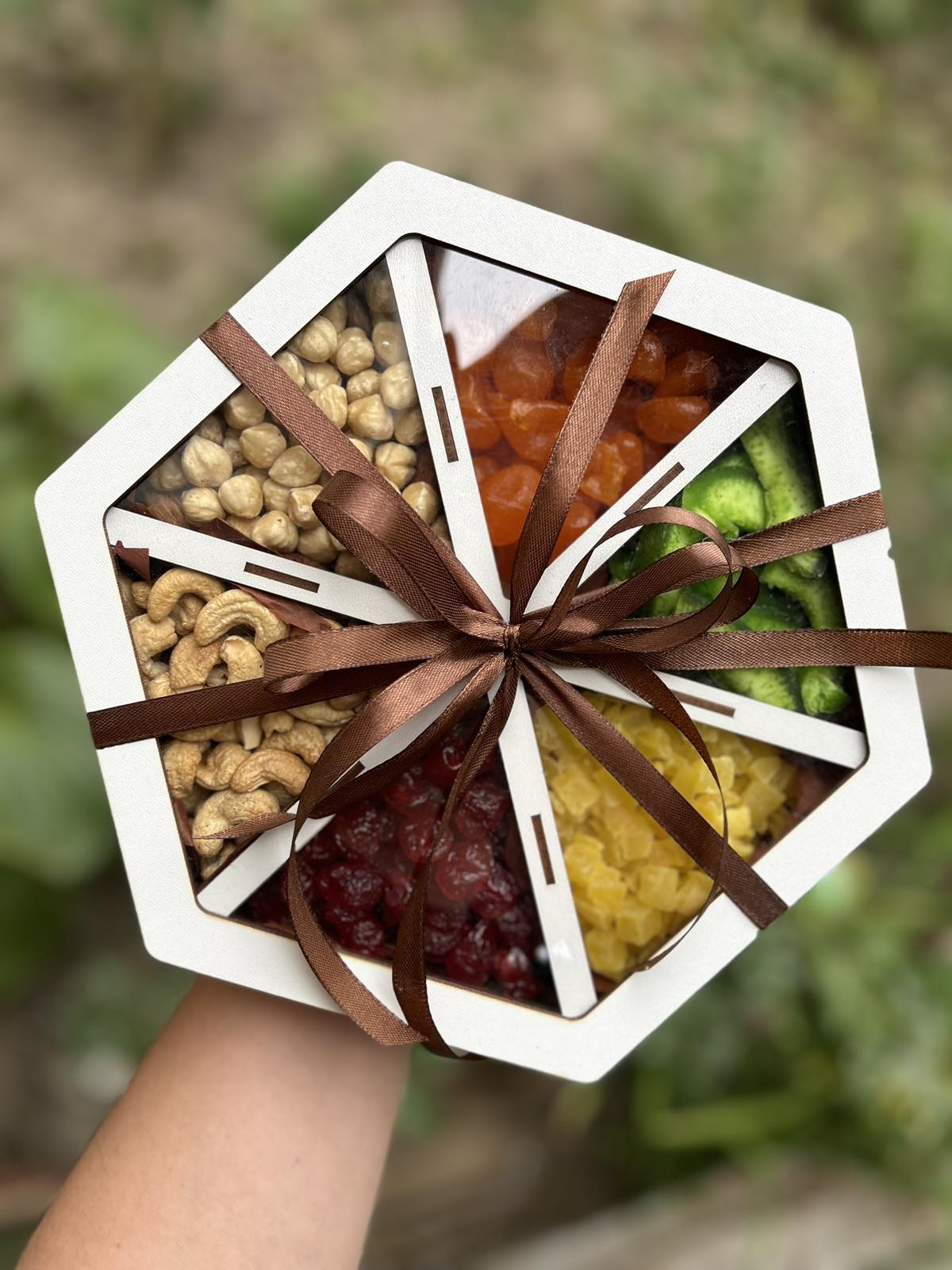 Ми зробимо подарунок максимально схожим на цей список та фото, проте форма подарункової коробки може бути трохи іншою. Також один або два види горіхів та/або фруктів можуть бути замінені на аналогічні, якщо ми не зможемо знайти такі самі види в наших місцевих магазинах.