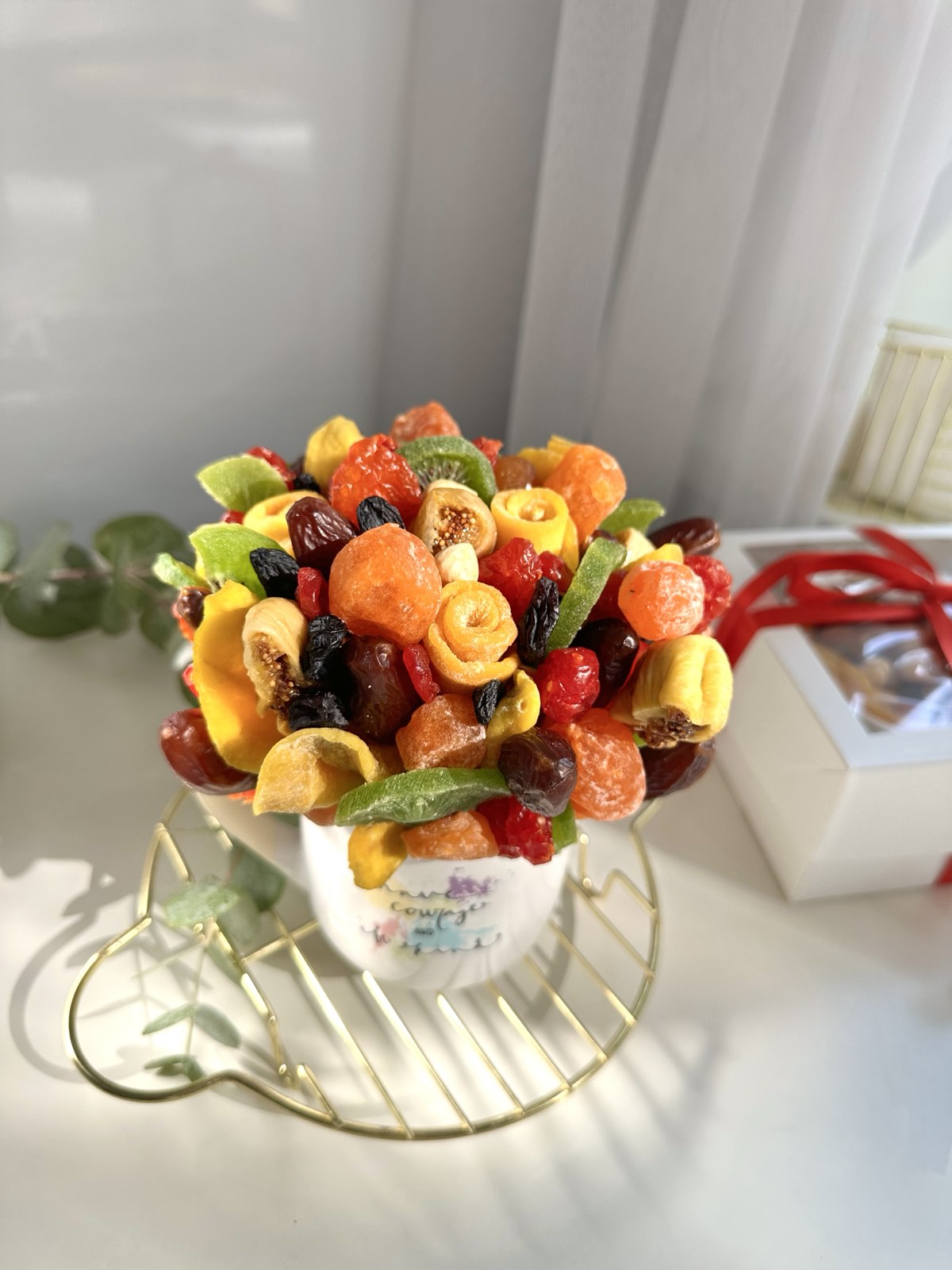 Оригінальна композиція із сухофруктів - цукатів у керамічній чашці. Яскраво, сонячно, гарно, смачно! Що ще потрібно для невеликого, але обраного з любов'ю, подарунка?