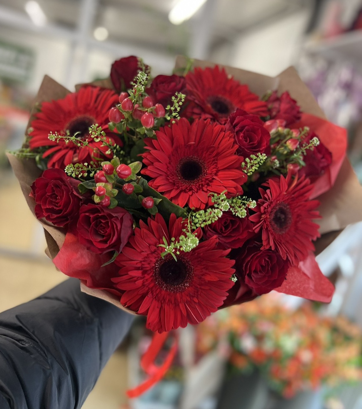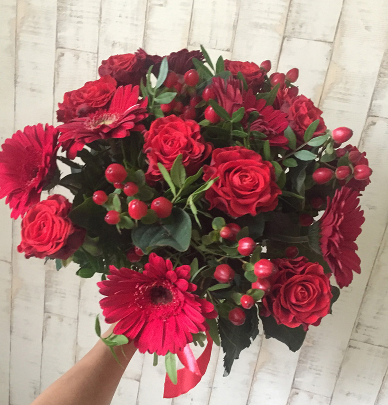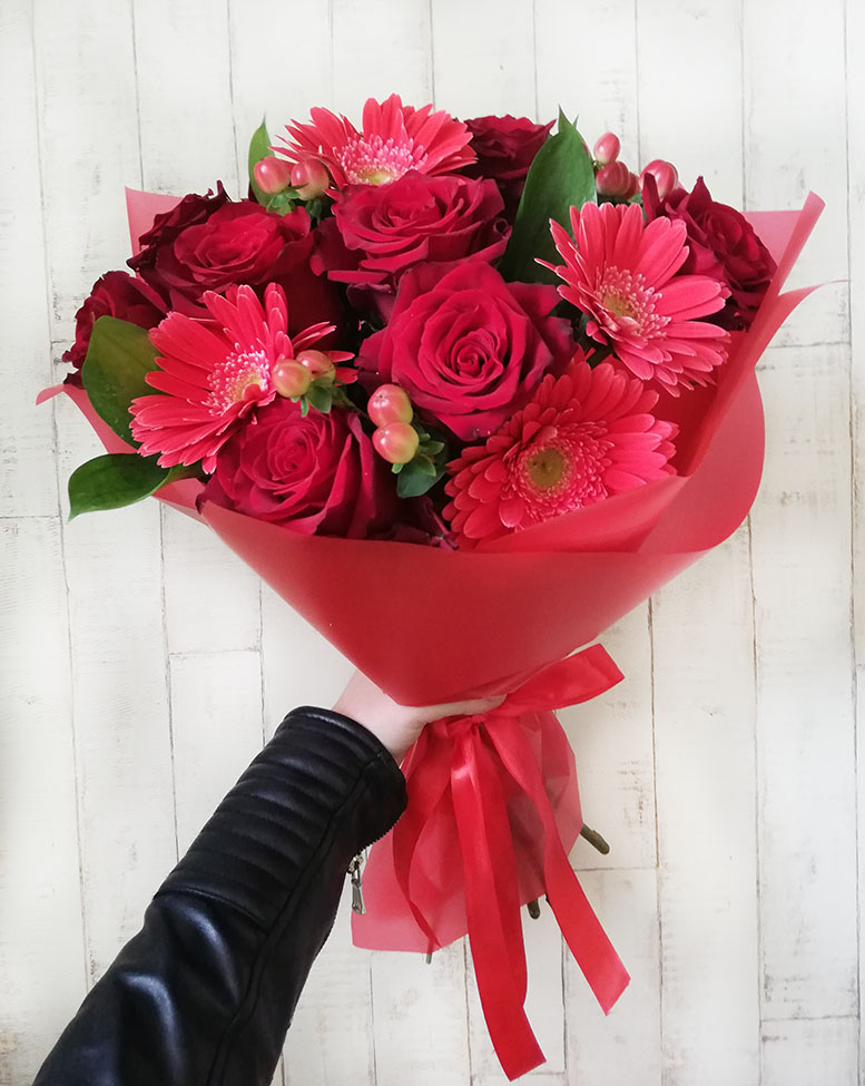 Яскравий, насичено червоний букет зігріє та зробить Ваш день яскравішим...де б Ви небули та при любій нагоді...